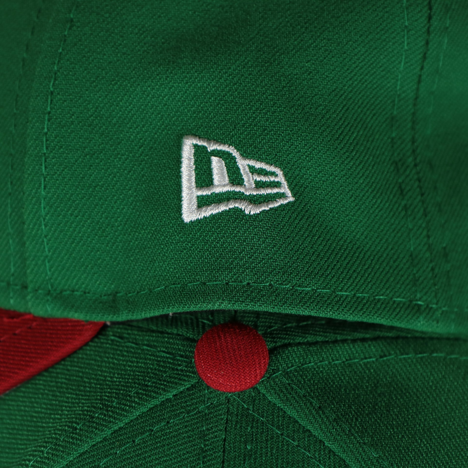 WEARER’S LEFT: The wearer’s left of the Mexico 2023 World Baseball Classic Two Tone Grey Bottom Green/Red 9Forty Dad Hat features the New Era Logo in white.