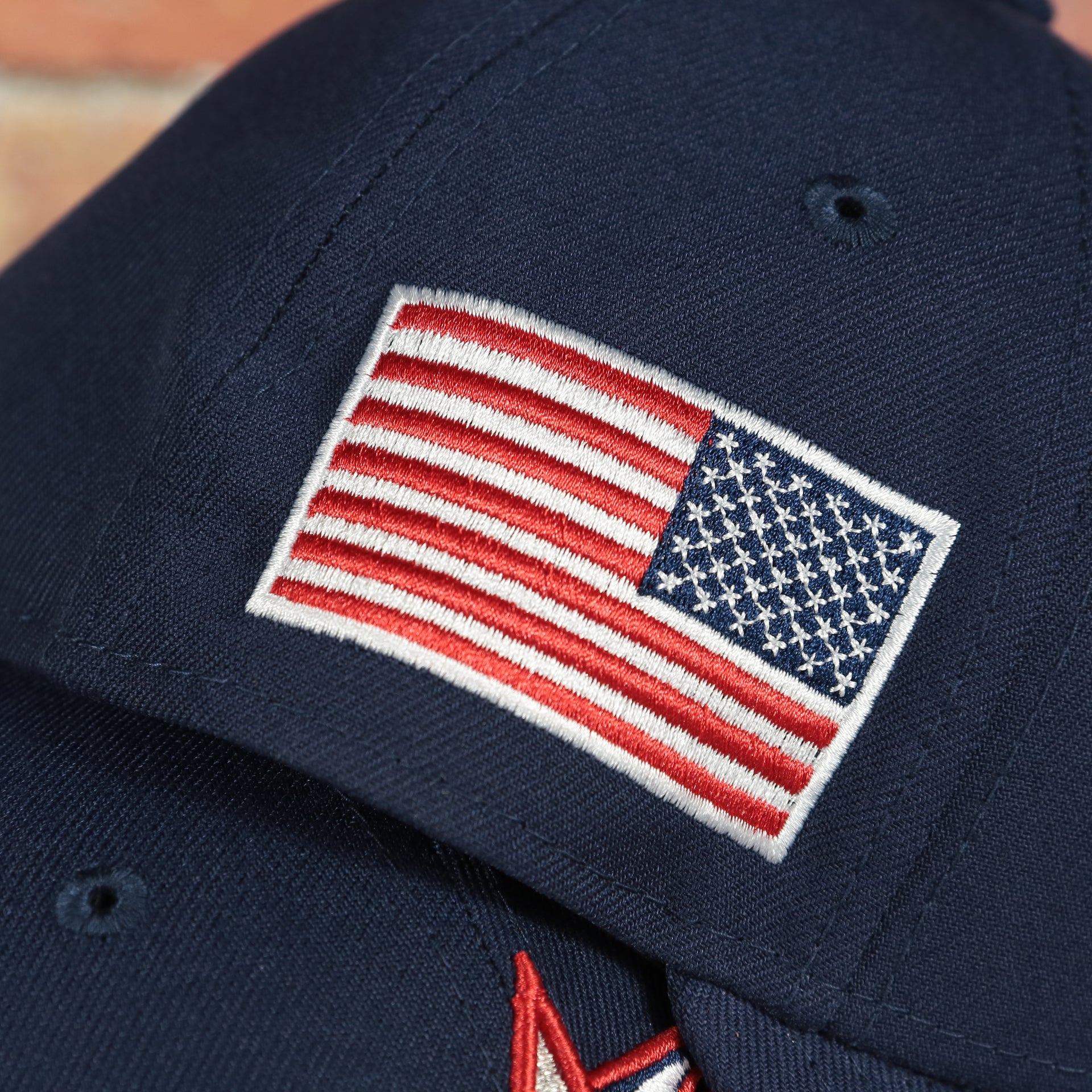 WEARER’S RIGHT: The wearer’s right of the United States 2023 World Baseball Classic Grey Bottom Navy 9Forty Dad Hat features the United States Flag.