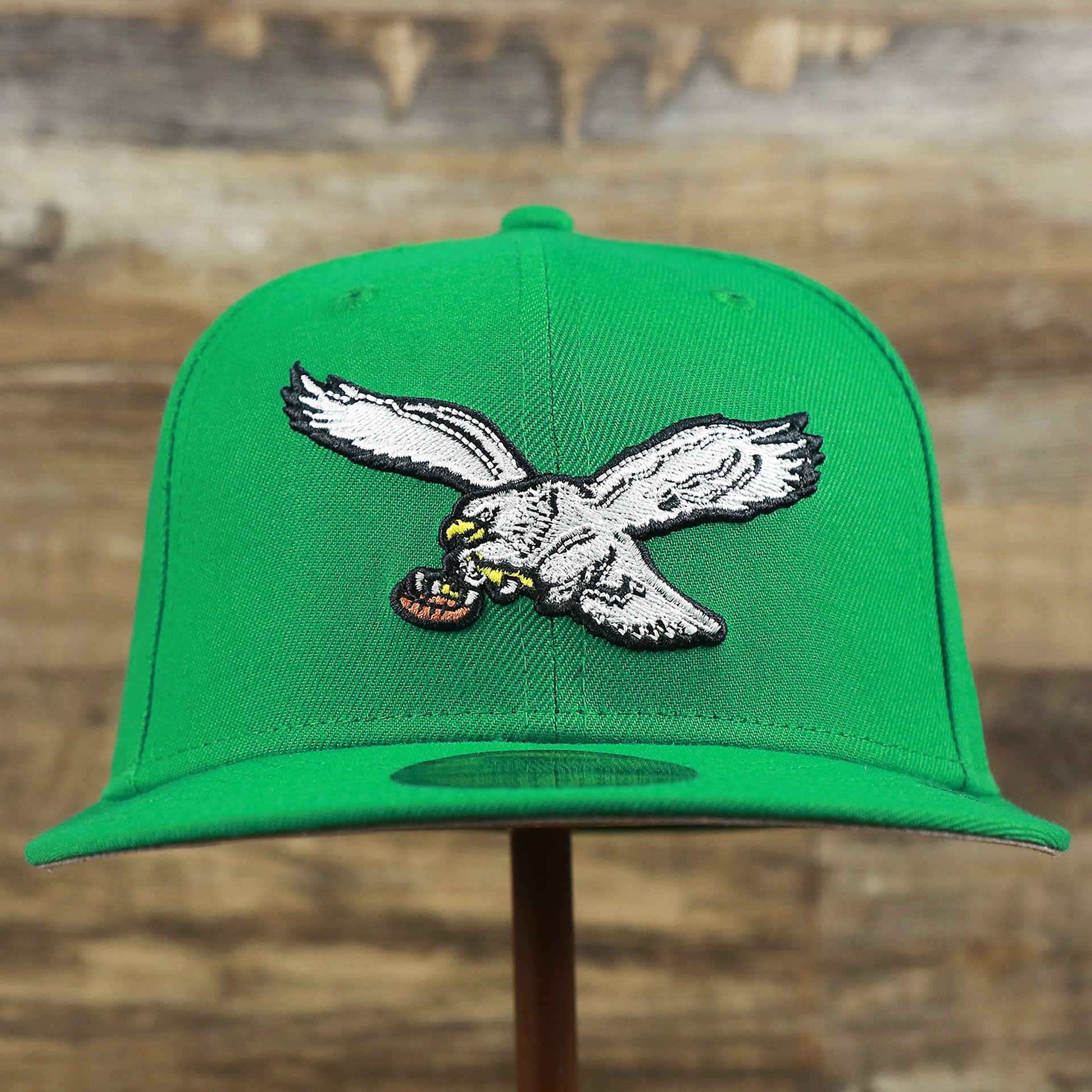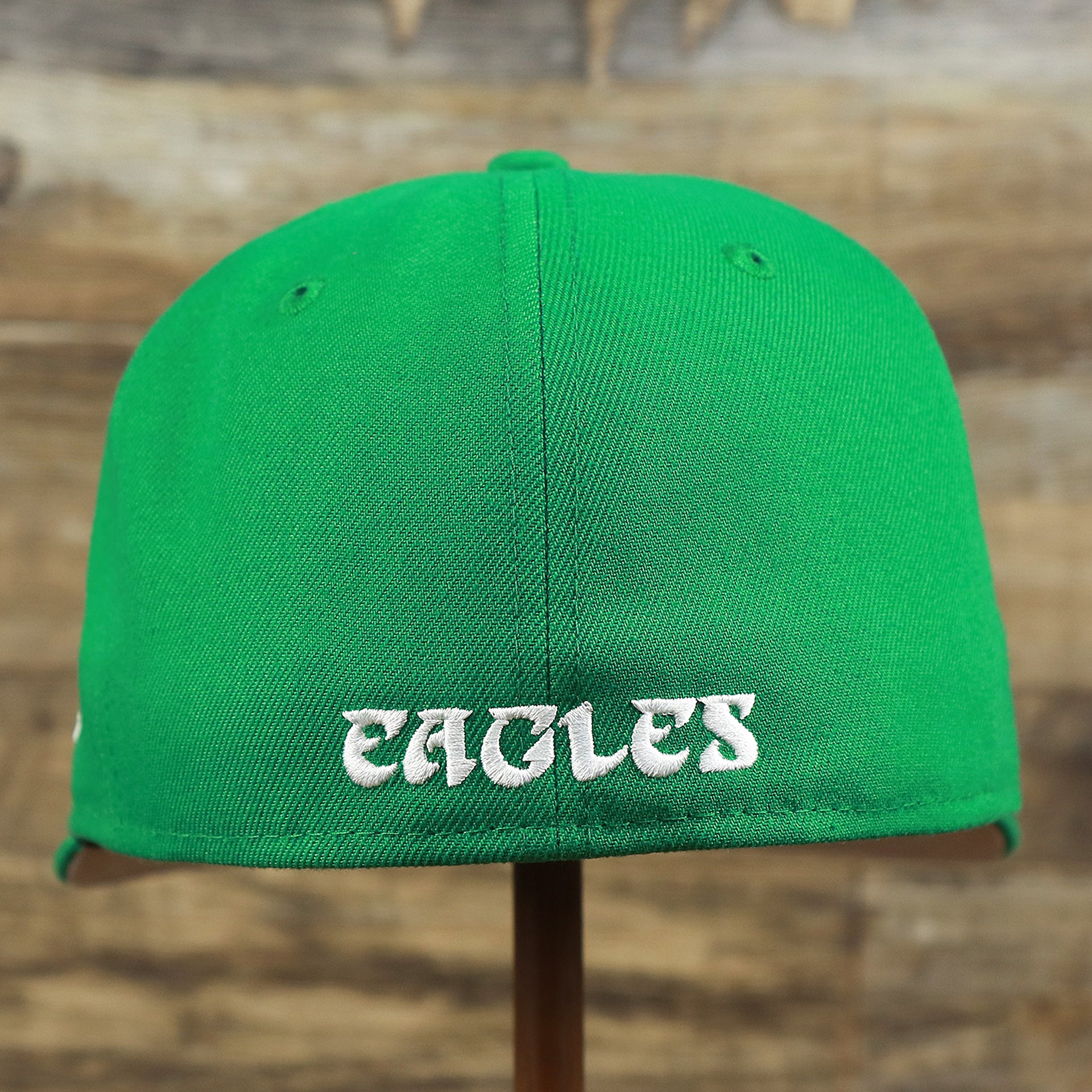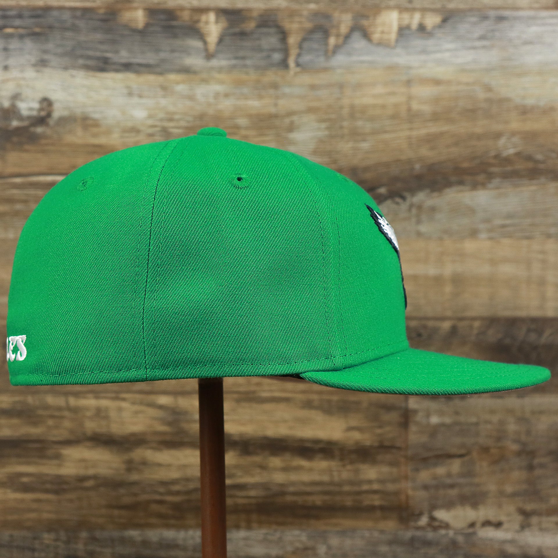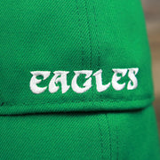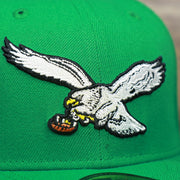 Go birds! Fly Eagles Fly! Get ready to show how much you love the Philadelphia Eagles with this custom Philadelphia Eagles vintage logo 5950 Fitted Cap from New Era. This Eagles fitted cap is perfect for any lover of the Philadelphia Eagles that wants to show their love for the Eagles as they dominate on the football field. This vintage Philadelphia Eagles kelly green 59fifty fitted cap is solid kelly green with a kelly green structured crown, kelly green button, kelly green flat brim, and gray under brim. On the front of the Philadelphia Eagles retrofitted cap is the throwback Philadelphia Eagles logo embroidered in white and black. On the left side of the Philadelphia Eagles throwback fitted cap is the New Era logo embroidered in white. On the back of the Philadelphia Eagles, vintage fitted cap is the NFL logo embroidered in white and black. Enjoy the comfortable fit of a New Era 59fifty fitted cap while showing love for the Philadelphia Eagles with this custom Philadelphia Eagles retro kelly green fitted cap today! buddy Ryan inspired fitted hat