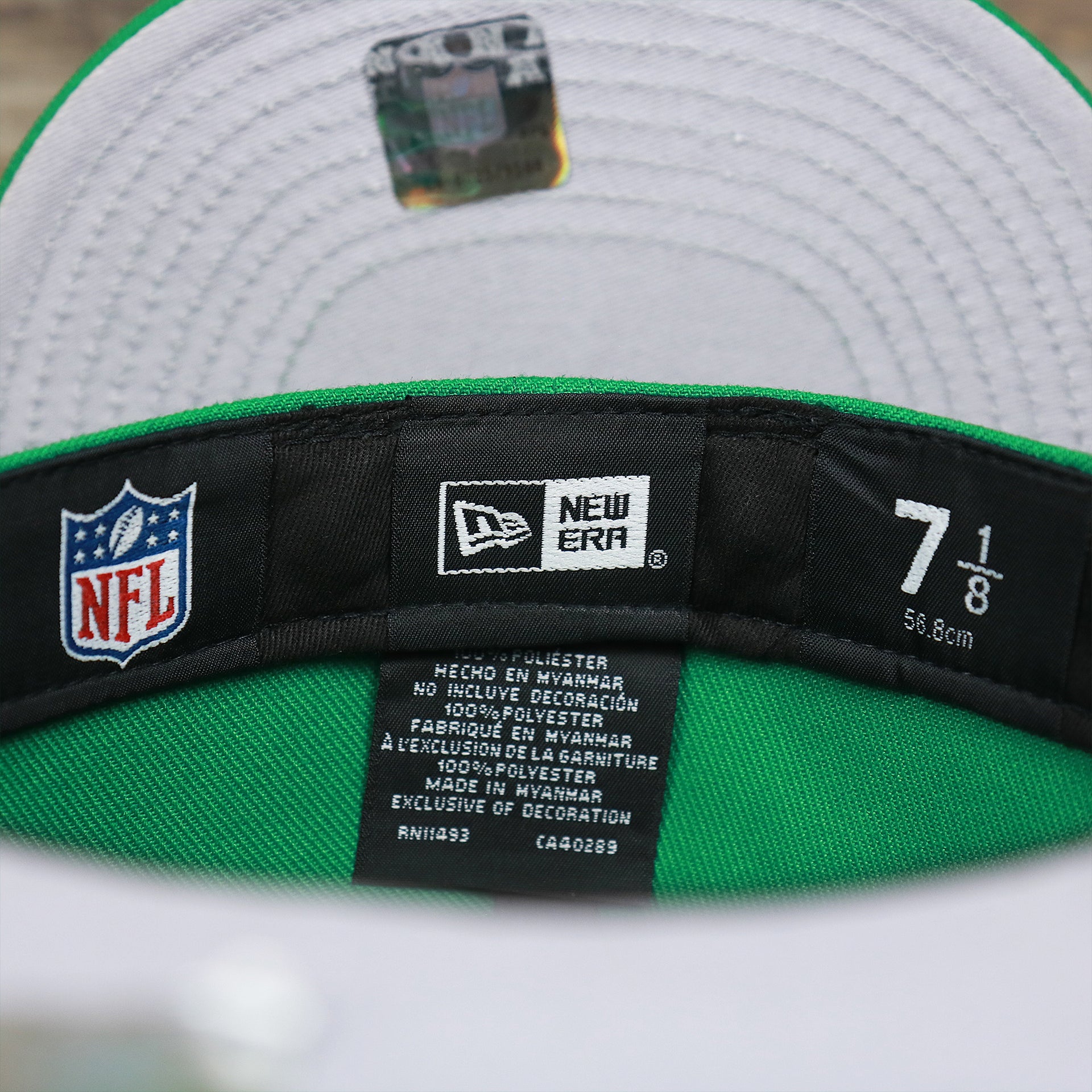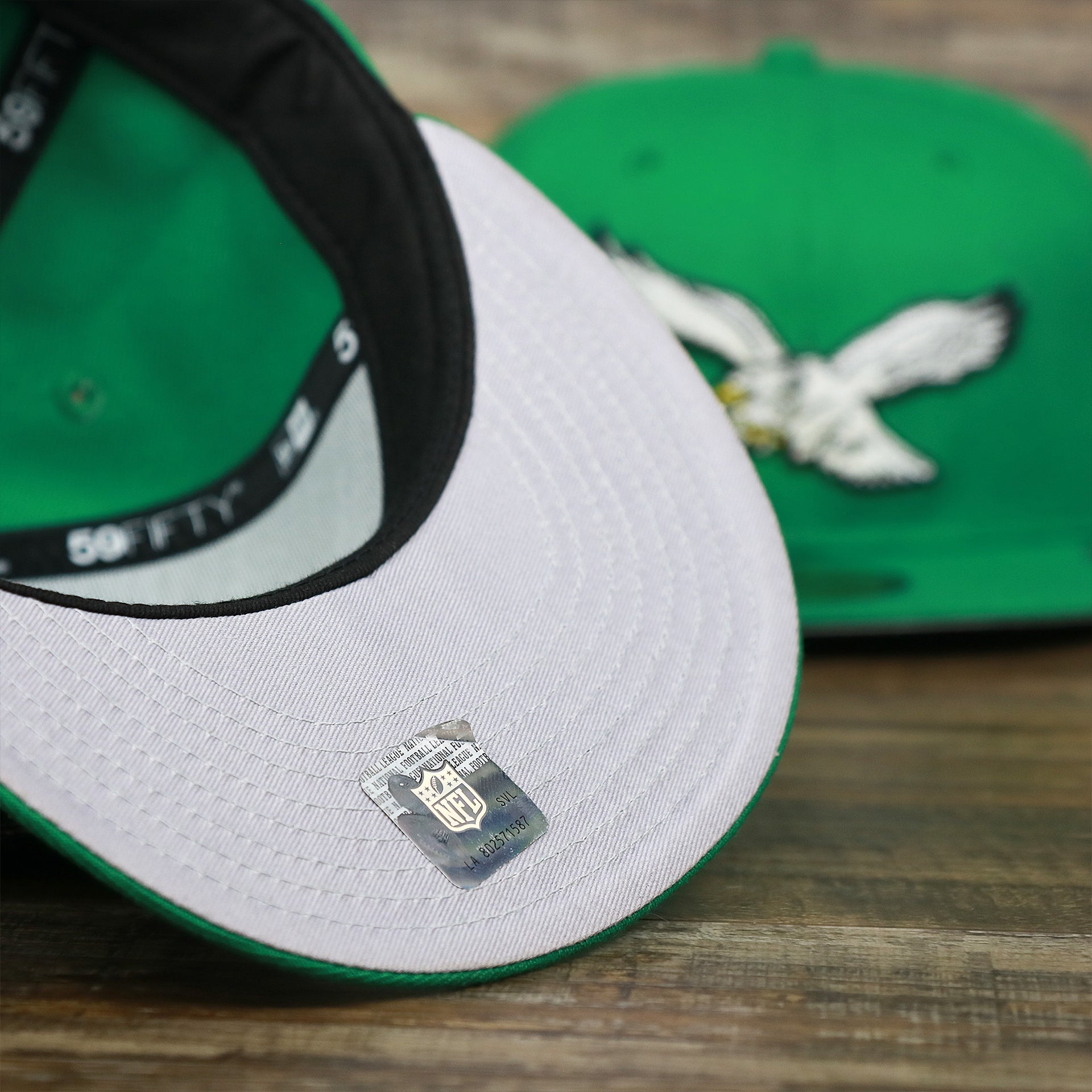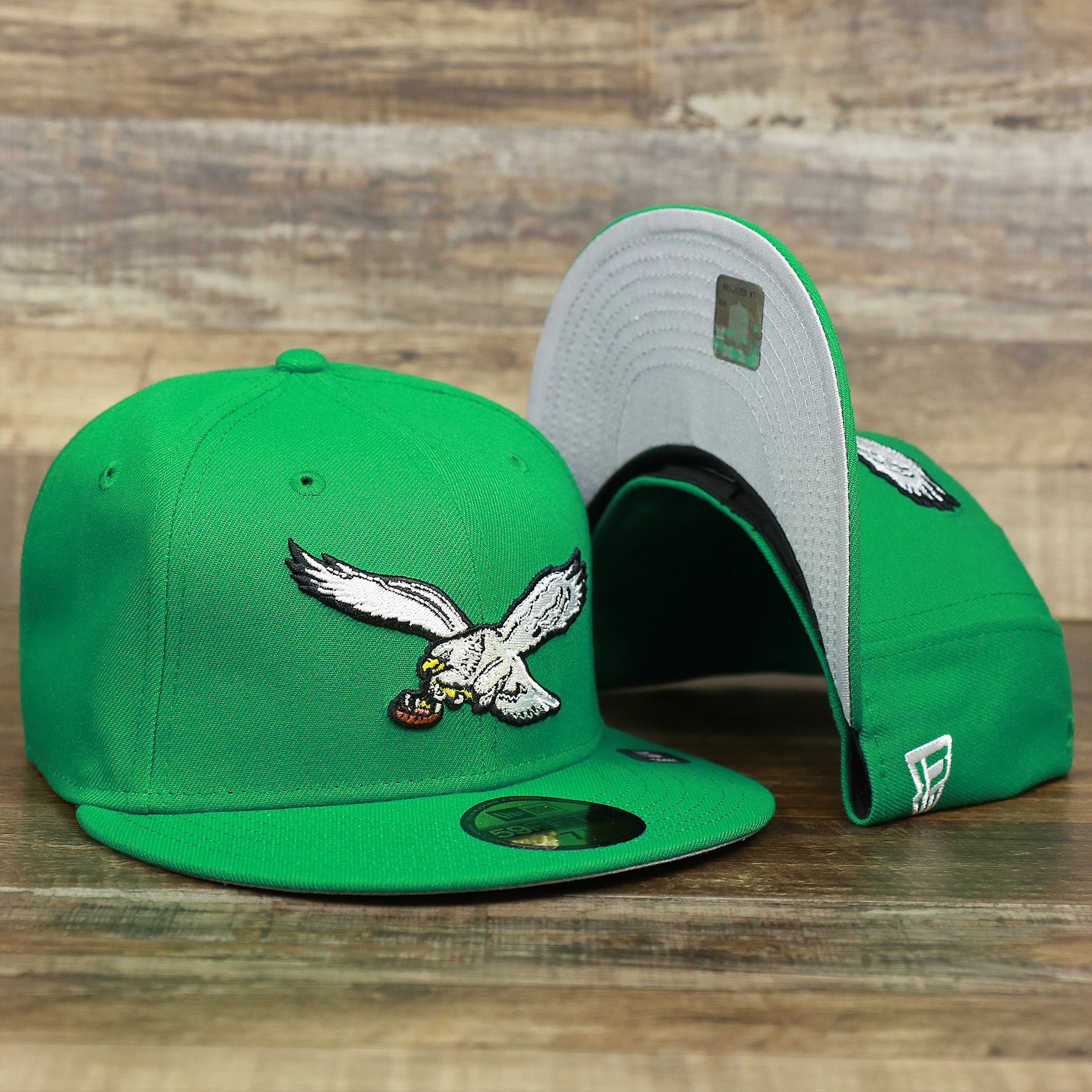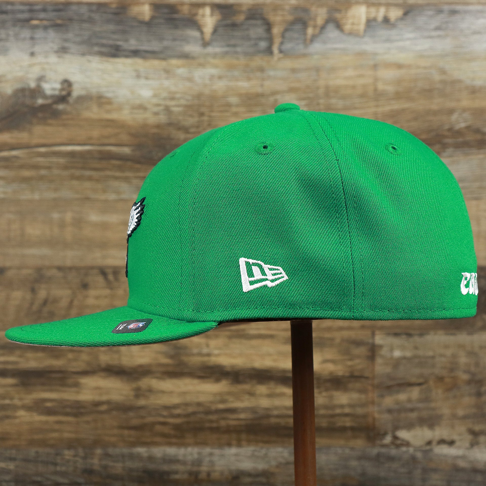 Go birds! Fly Eagles Fly! Get ready to show how much you love the Philadelphia Eagles with this custom Philadelphia Eagles vintage logo 5950 Fitted Cap from New Era. This Eagles fitted cap is perfect for any lover of the Philadelphia Eagles that wants to show their love for the Eagles as they dominate on the football field. This vintage Philadelphia Eagles kelly green 59fifty fitted cap is solid kelly green with a kelly green structured crown, kelly green button, kelly green flat brim, and gray under brim. On the front of the Philadelphia Eagles retrofitted cap is the throwback Philadelphia Eagles logo embroidered in white and black. On the left side of the Philadelphia Eagles throwback fitted cap is the New Era logo embroidered in white. On the back of the Philadelphia Eagles, vintage fitted cap is the NFL logo embroidered in white and black. Enjoy the comfortable fit of a New Era 59fifty fitted cap while showing love for the Philadelphia Eagles with this custom Philadelphia Eagles retro kelly green fitted cap today! buddy Ryan inspired fitted hat