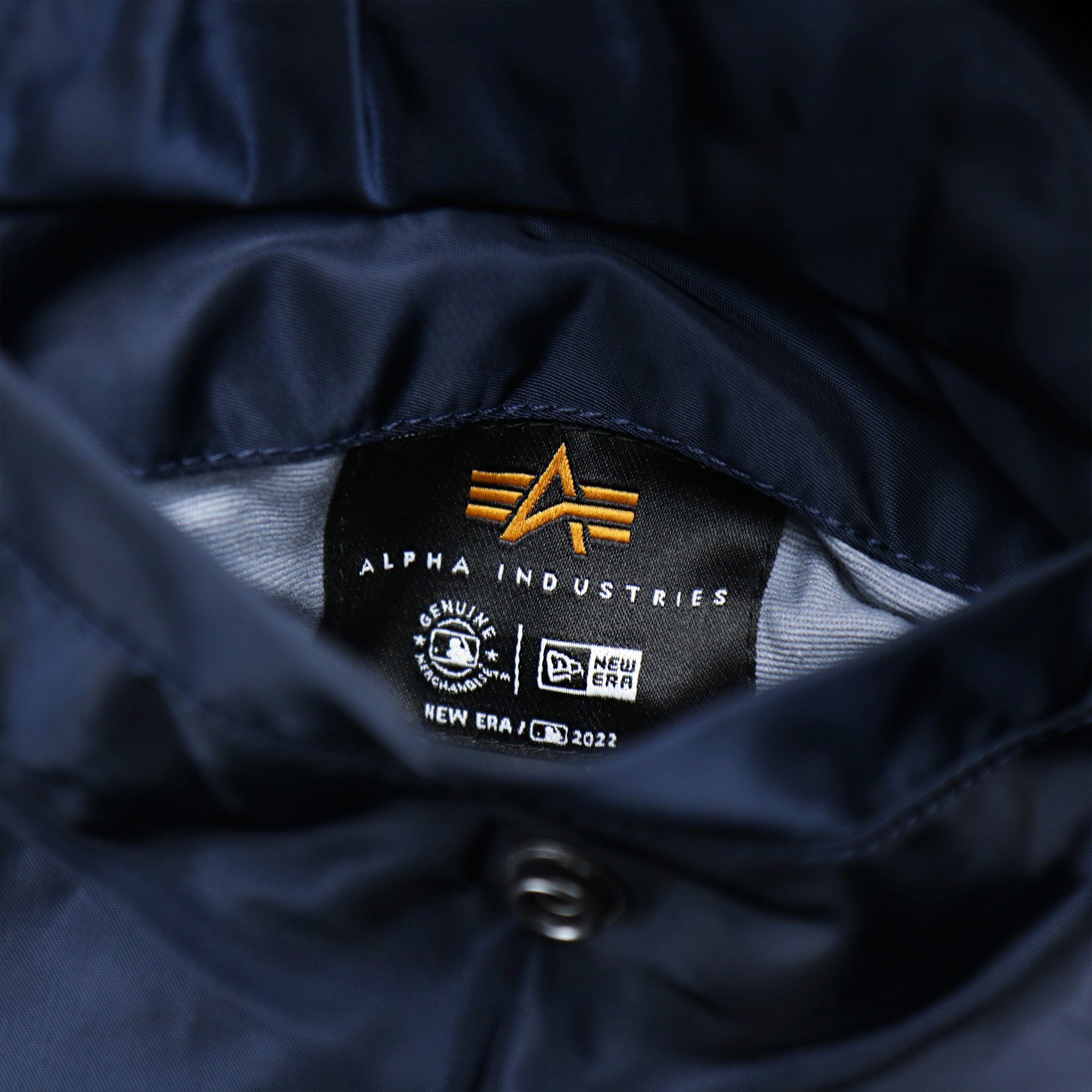 WEARER’S LEFT SLEEVE: The wearer’s left of the Double Sided MLB Alpha Industries Bomber Jacket features a navy blue zipper pocket with Alpha Industries Hangtag and a Black and Yellow 3X Champions Side Patch alongside the New Era Logo in White.