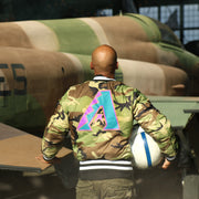 LINER BACKSIDE: The backside of the camo liner on the Vintage MLB Alpha Industries Cooperstown Arizona Diamondbacks Double Sided Bomber Jacket with Retro Diamondbacks Wordmark is the Arizona Diamondbacks Logo printed in the Diamondbacks Retro Colors.