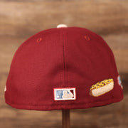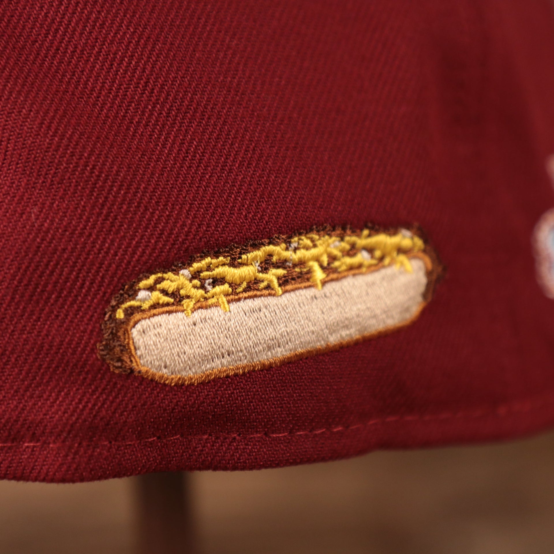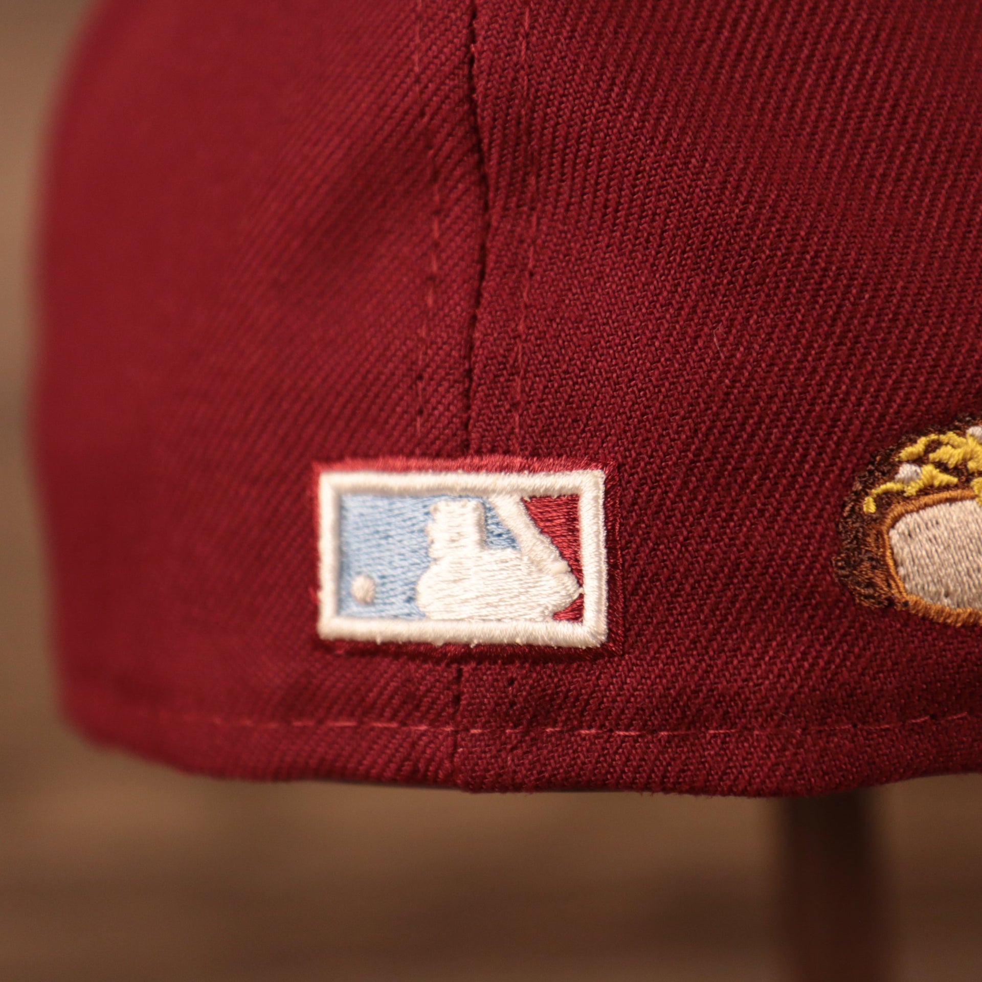 Back: On the wearer's backside of the maroon 1980 World Series all over patch fitted 5950 cap is the patch for Major League Baseball (MLB), and we can also see a patch for a cheesesteak besides the MLB patch.
