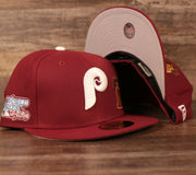For the Philadelphia Phillies crowd at capswag.com, we have this super cool retro all over embroidered maroon 5950 cap. This grey bottom brim is for all the Philadelphia Phillies supporters to cherish the legacy of the 1980 World Series and the great performance of their team.