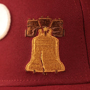 Front: On the front side of this maroon all over patch fitted cap is the retro logo of the Philadelphia Phillies in white. Besides the Phillies logo, we can also see the patch of the Liberty Bell on the front side of this Phillies all over embroidered 59fifty fitted hat.