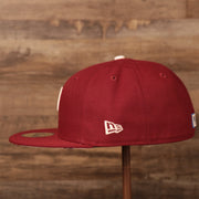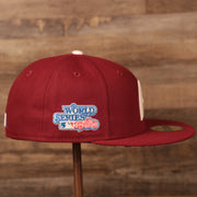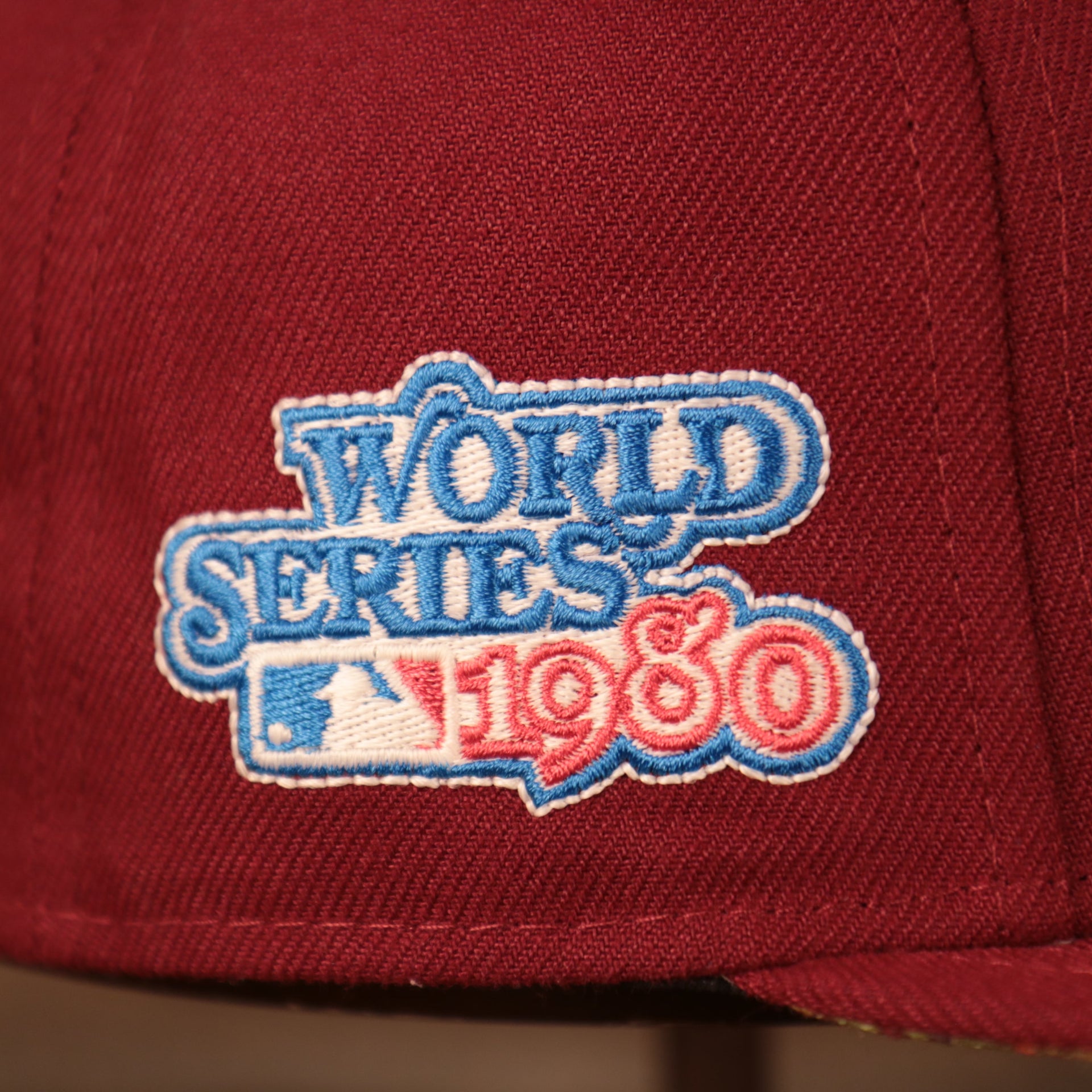 It has a retro white glow in the dark Phillies logo patch on the front side which looks very stylish on the maroon crown. With that, this maroon side patch hat, made in collaboration with New Era, also has a patch for MLB at the backside of it, and a New Era logo, in white on the left side. While the all important 1980 World Series patch is on the wearer's right side of this dope 59fifty side patch fitted cap.