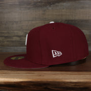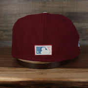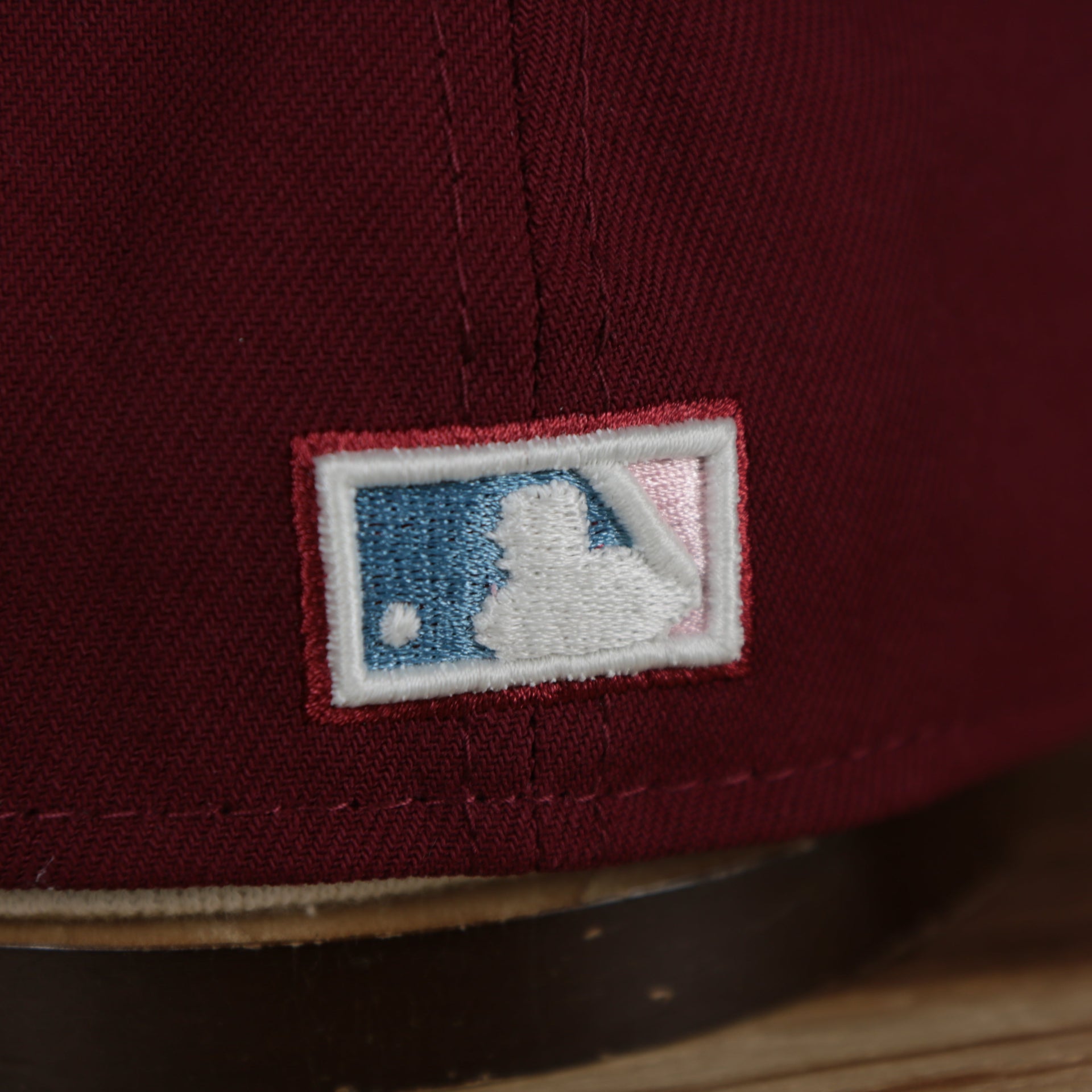 WEARER'S RIGHT: The wearer's right of this Philadelphia Phillies 1980 World Series Glow In The Dark Pink Brim 59fifty Cap | Maroon is where this must-have patch fitted really shines, thanks to the 1980 World Series Philadelphia Phillies side patch embroidered in Light Blue, White, and Pink.