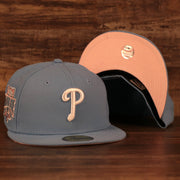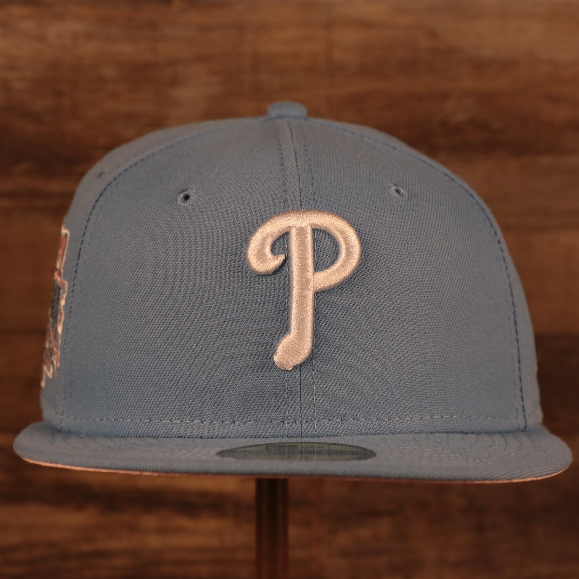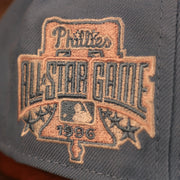 UNDER VISOR: This Philadelphia Phillies 1996 All Star Game Icy Blue Pink Bottom Side Patch 59Fifty Fitted Cap is a pink bottom fitted cap meaning it features a light pink under visor.