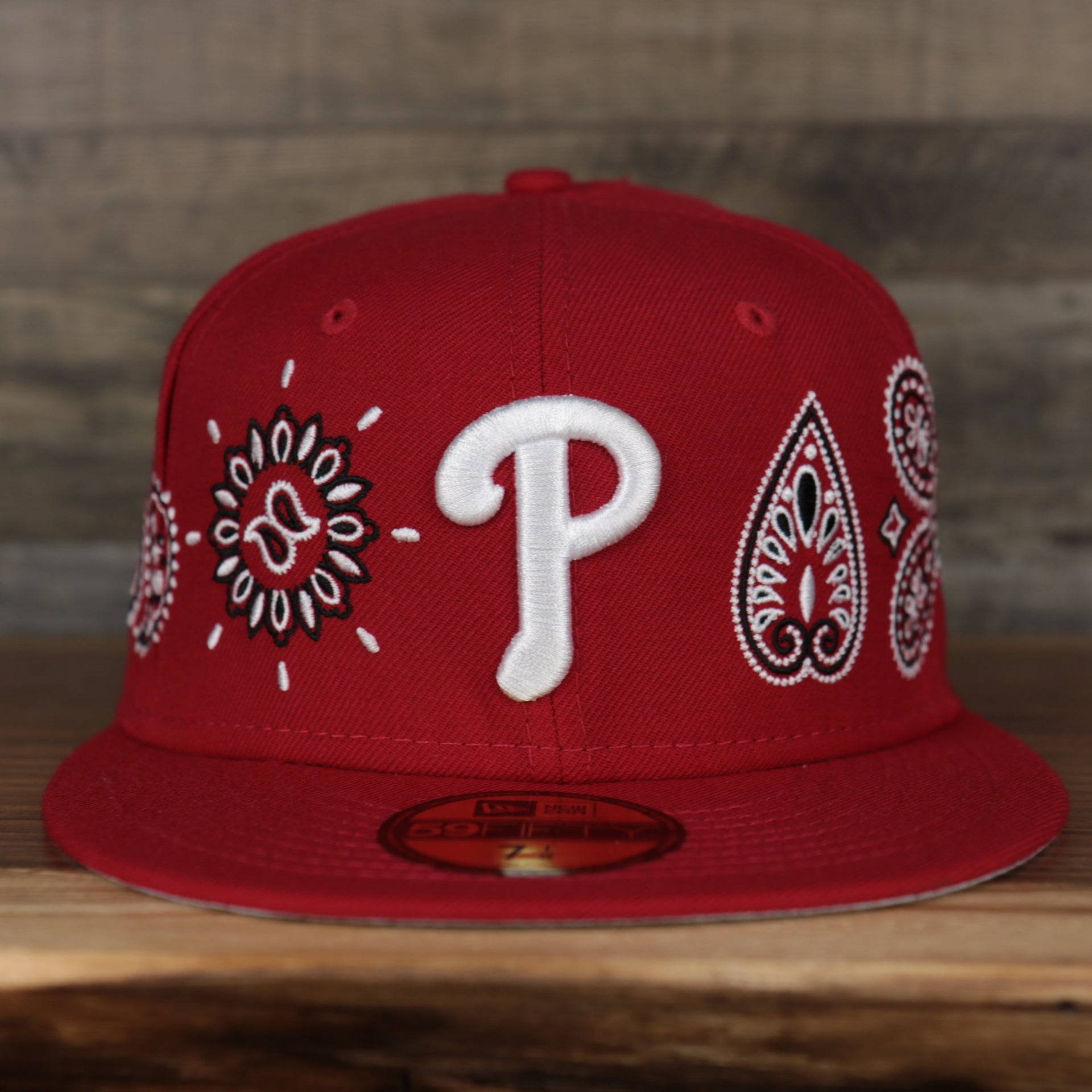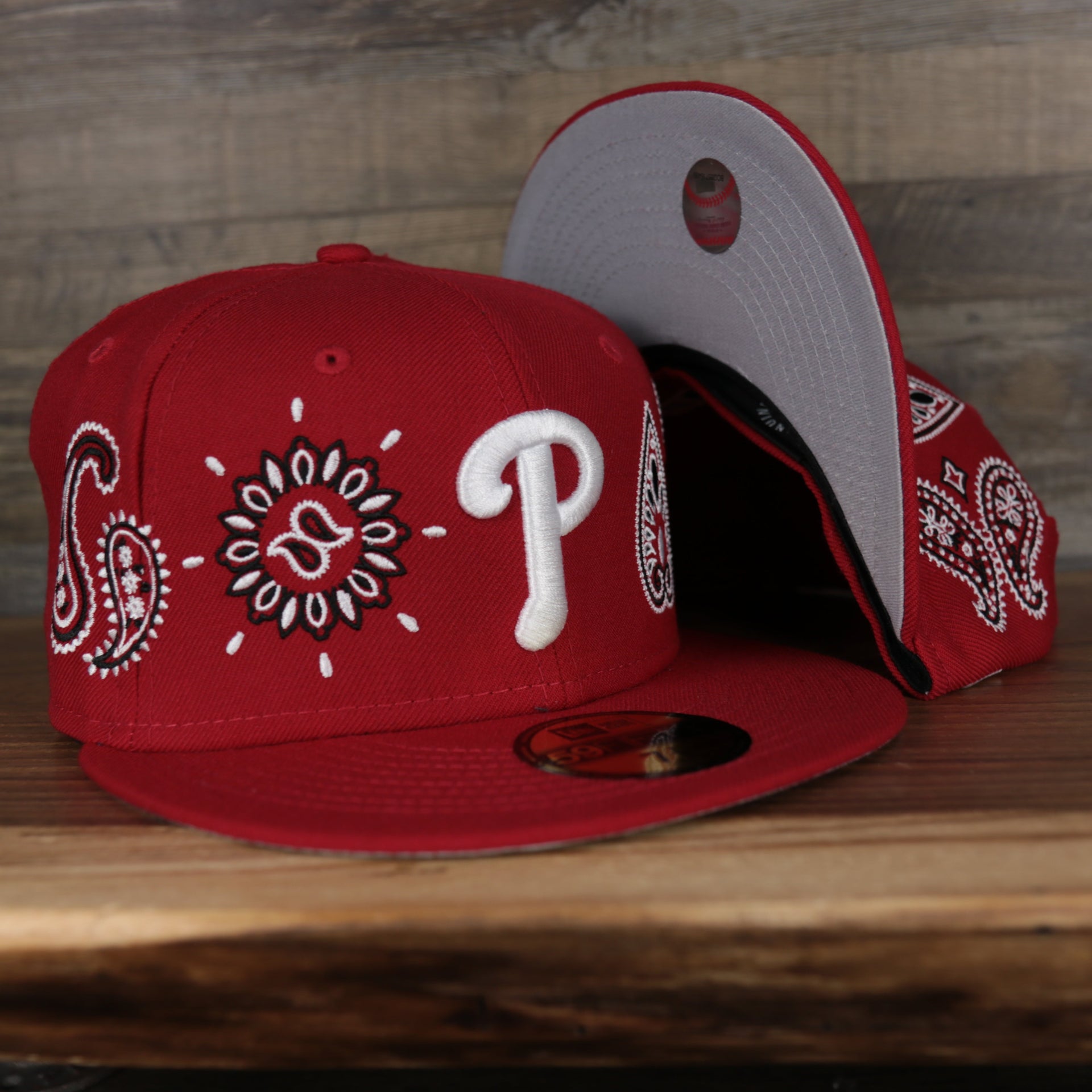 Do not miss out! This Paisley Bandana Pattern 5950 is extremely limited. These will sell out quickly. If you're trying to up your fitted game, start by copping a Philadelphia Phillies All Over Paisley Bandana Pattern Grey Bottom Red 5950 Fitted Cap | Bandana Paisley today!!!