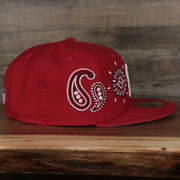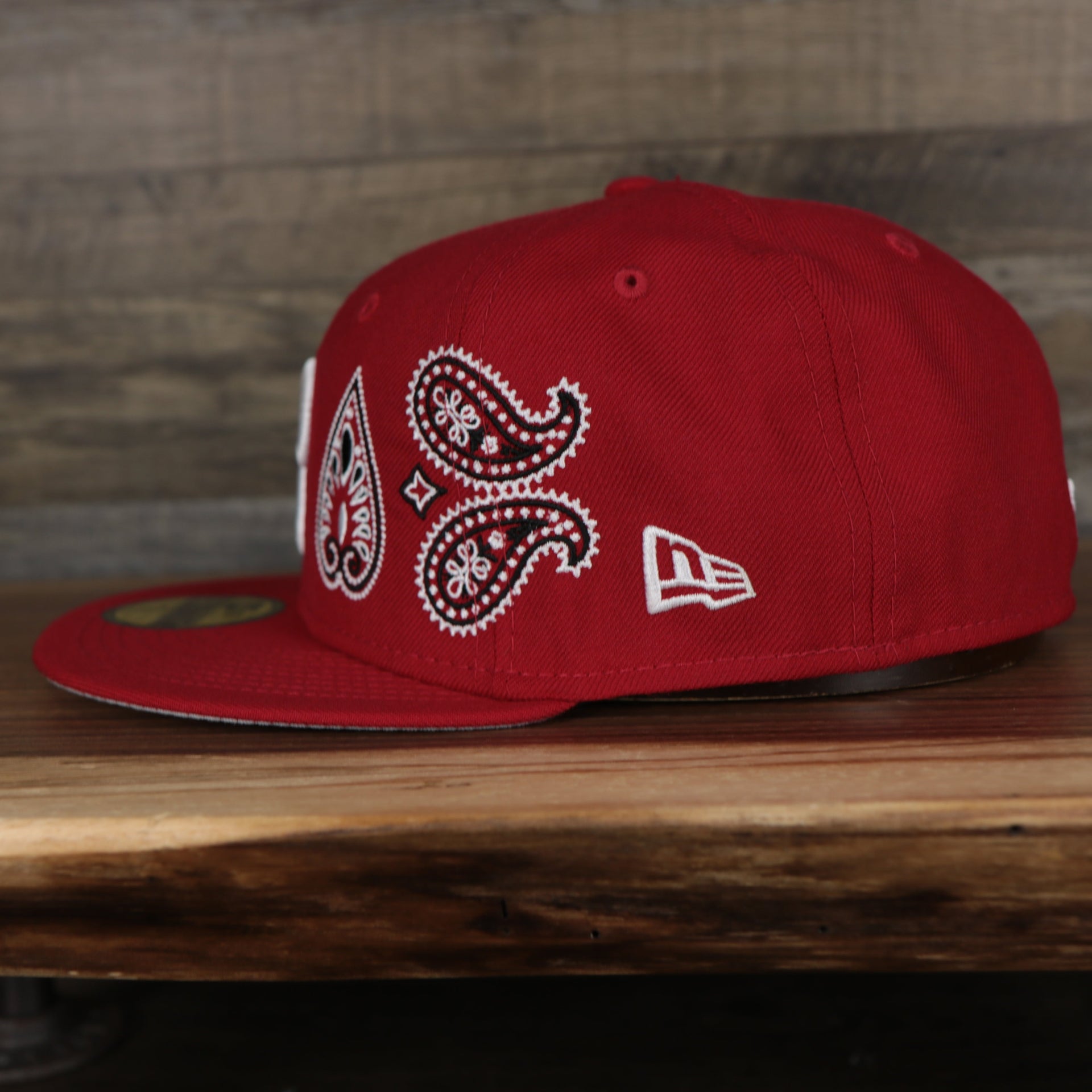 WEARER'S RIGHT: The wearer's right of this Philadelphia Phillies All Over Paisley Bandana Pattern Grey Bottom Red 5950 Fitted Cap | Bandana Paisley has some more of the amazing all over Paisley pattern.