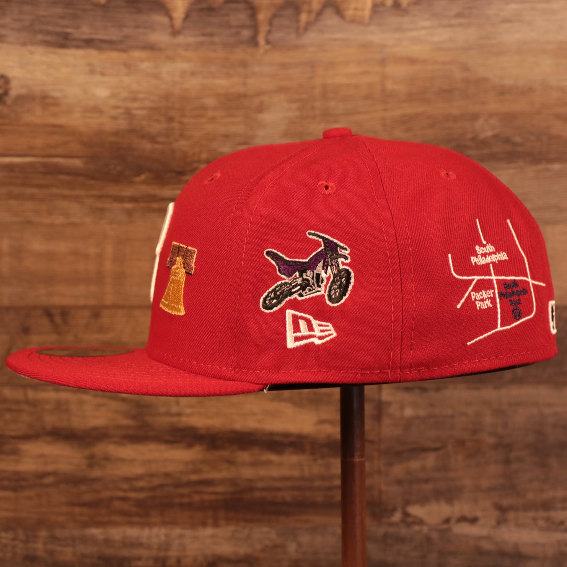 This Philadelphia Phillies 59Fifty side patch fitted highlights some of the most iconic parts of Philly through embroidered patches all over the fitted cap.