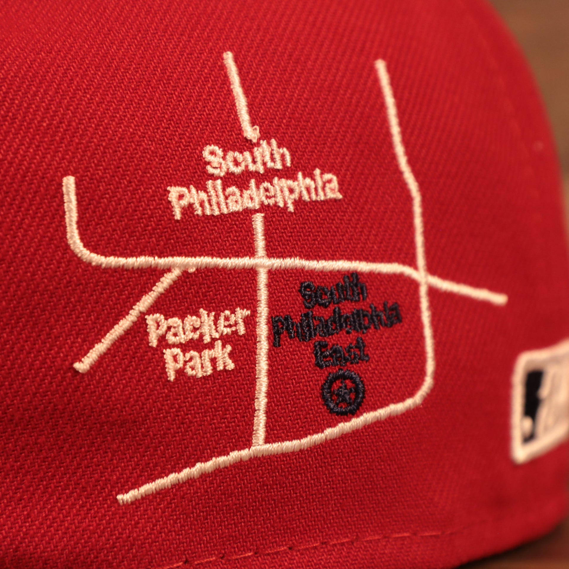 BACK - The back of this 59Fifty gray bottom side patch Phillies fitted cap is where it really shines. The back left panel features a large transit map of Philadelphia with South Philadelphia East highlighted in black embroidery. Of course as always, we have the MLB Batterman logo embroidered on the center of the MLB side patch fitted.