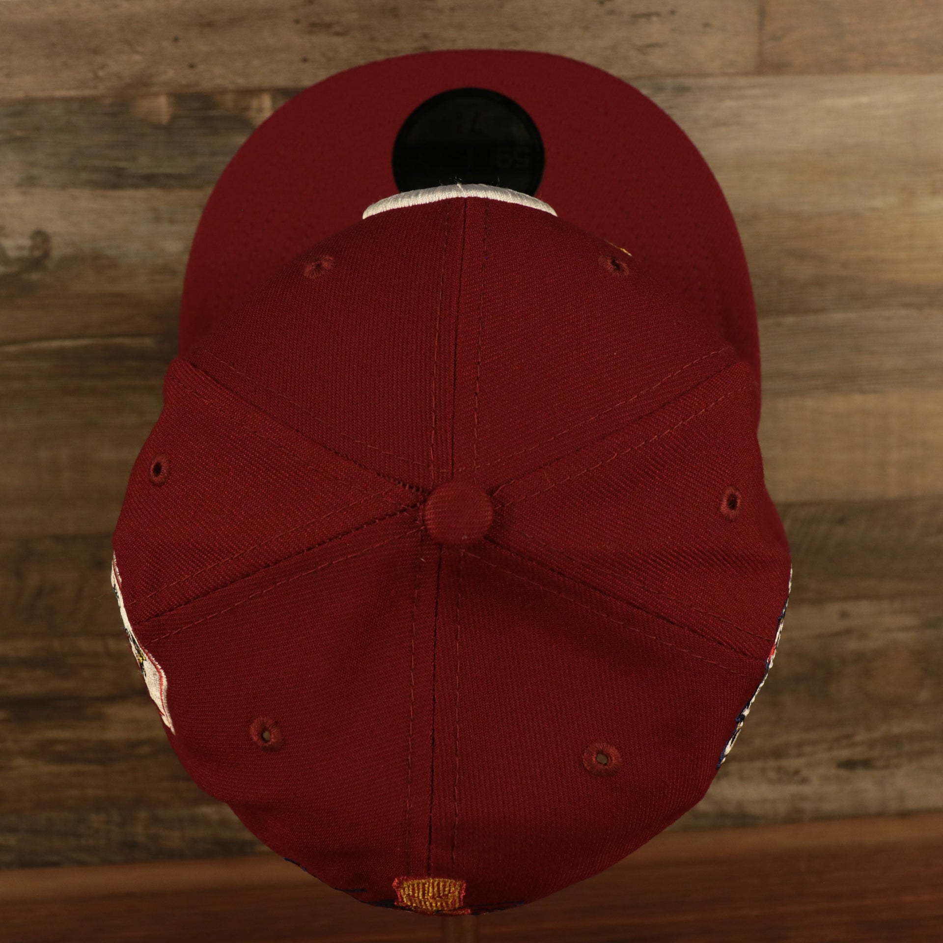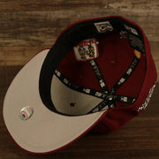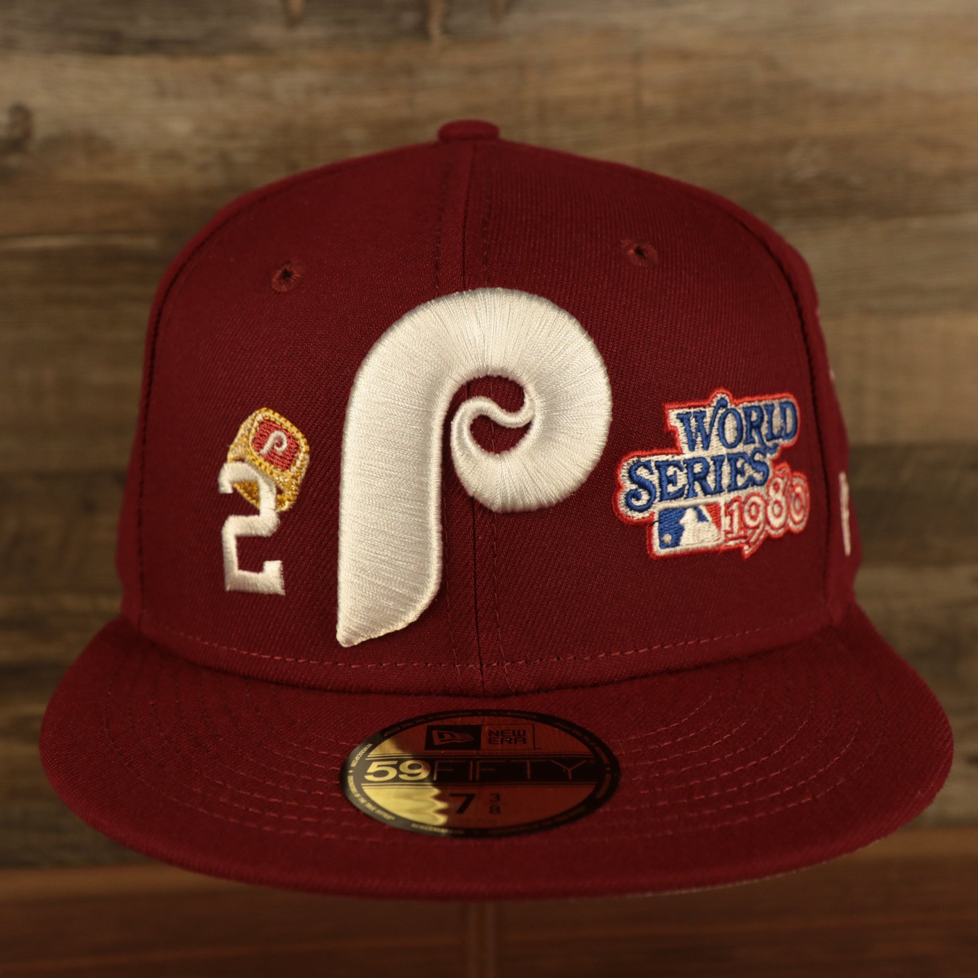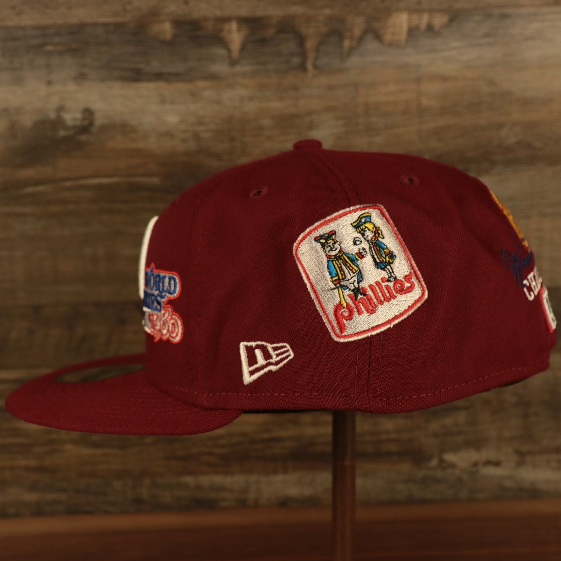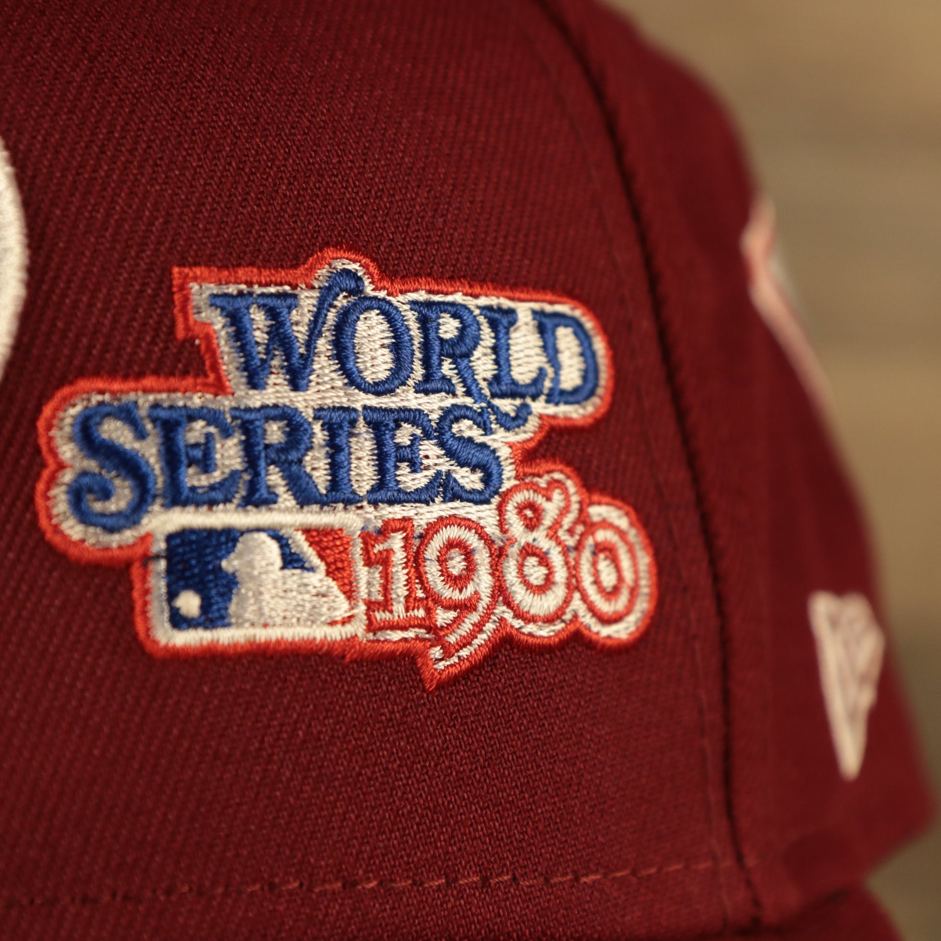 WEARER’S RIGHT: On the wearer’s right side of this Grey Bottom Maroon Phillies World Series Side Patch Fitted is the 2008 World Series Championship side patch logo.