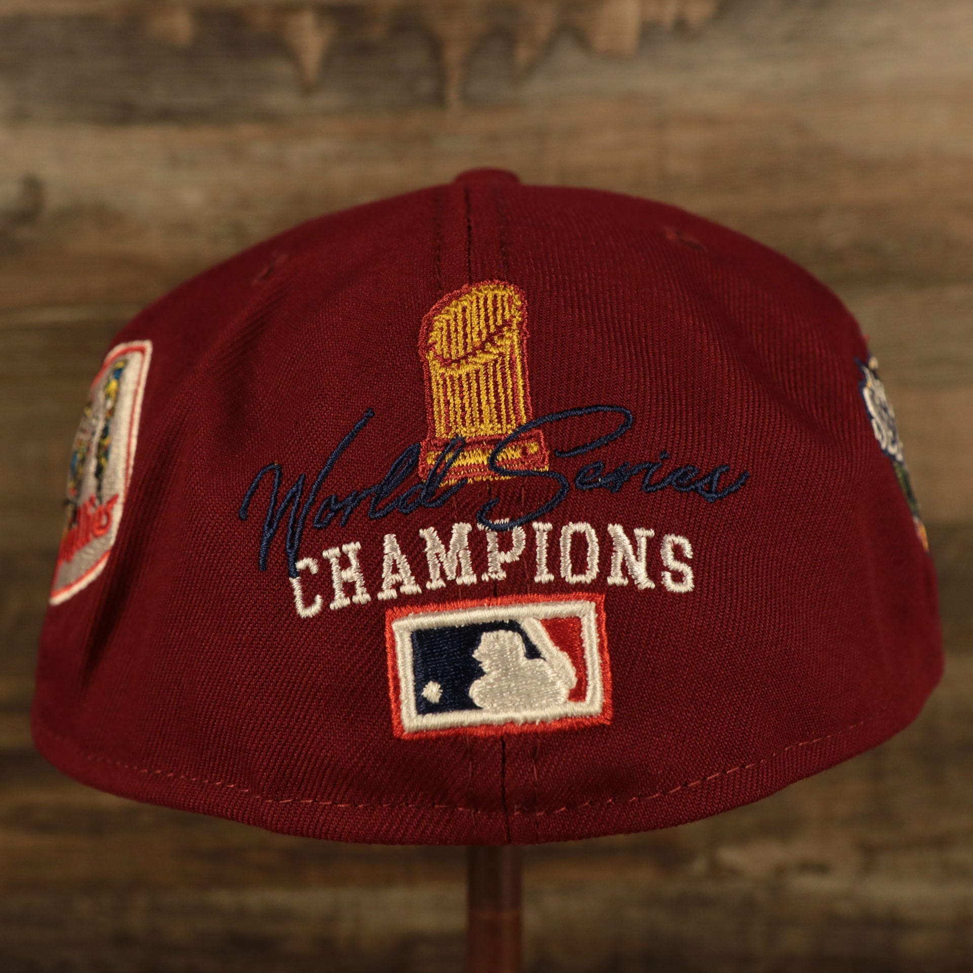 BACK: The back of the Phillies 59fifty Fitted has a patch that says World Series Champions with the World Series Trophy right on top of it. Below that patch is the classic Cooperstown Batterman Logo.