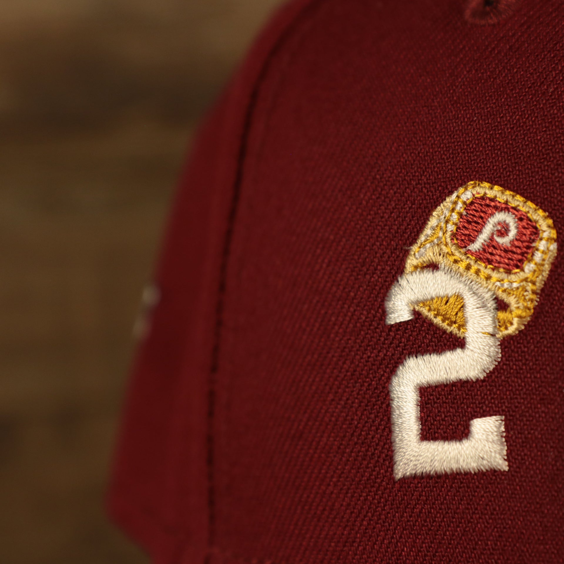 FRONT: On the front of the Philadelphia Phillies "Championship Rings" Cooperstown Side Patch Fitted Cap is the Phillies retro logo with the 1980 World Series patch and the number 2 for how many rings they have.