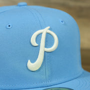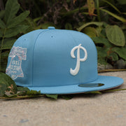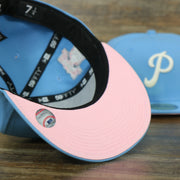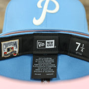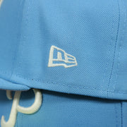 Stay icy with this exclusive fitted hat from the latest collab between New Era and Cap Swag custom. If you love side patch fitteds, world series hats, and just fitted hats with patches in general, you'll love this icy blue New York Yankees Cooperstown icy blue side patch fitted from New Era. When we were designing this Philadelphia Phillies Glow In The Dark 1952 All Star Game Patch Pink Bottom Side Patch 59Fifty Fitted Cap we knew we wanted to elevate the game of our previous icy blue pink bottom Phillies fitted, so we went all out by bringing back the old school 1950's Cooperstown Phillies logo, busting out the vintage 1950 era All Star Game Patch, and incorporating glow in the dark thread in every logo. this custom 59Fifty MLB Fitted Hat with patches was made with love so you could elevate your side patch fitted collection. Just take a look at all the detail: