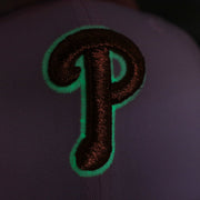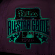 FRONT: On the front of the Philadelphia Phillies Glow In The Dark 1996 All Star Game "il napoletano" Sky Blue Bottom Side Patch 59Fifty Fitted Cap, the Philadelphia Phillies logo is embroidered in copper metallic thread with a glow in the dark outline.