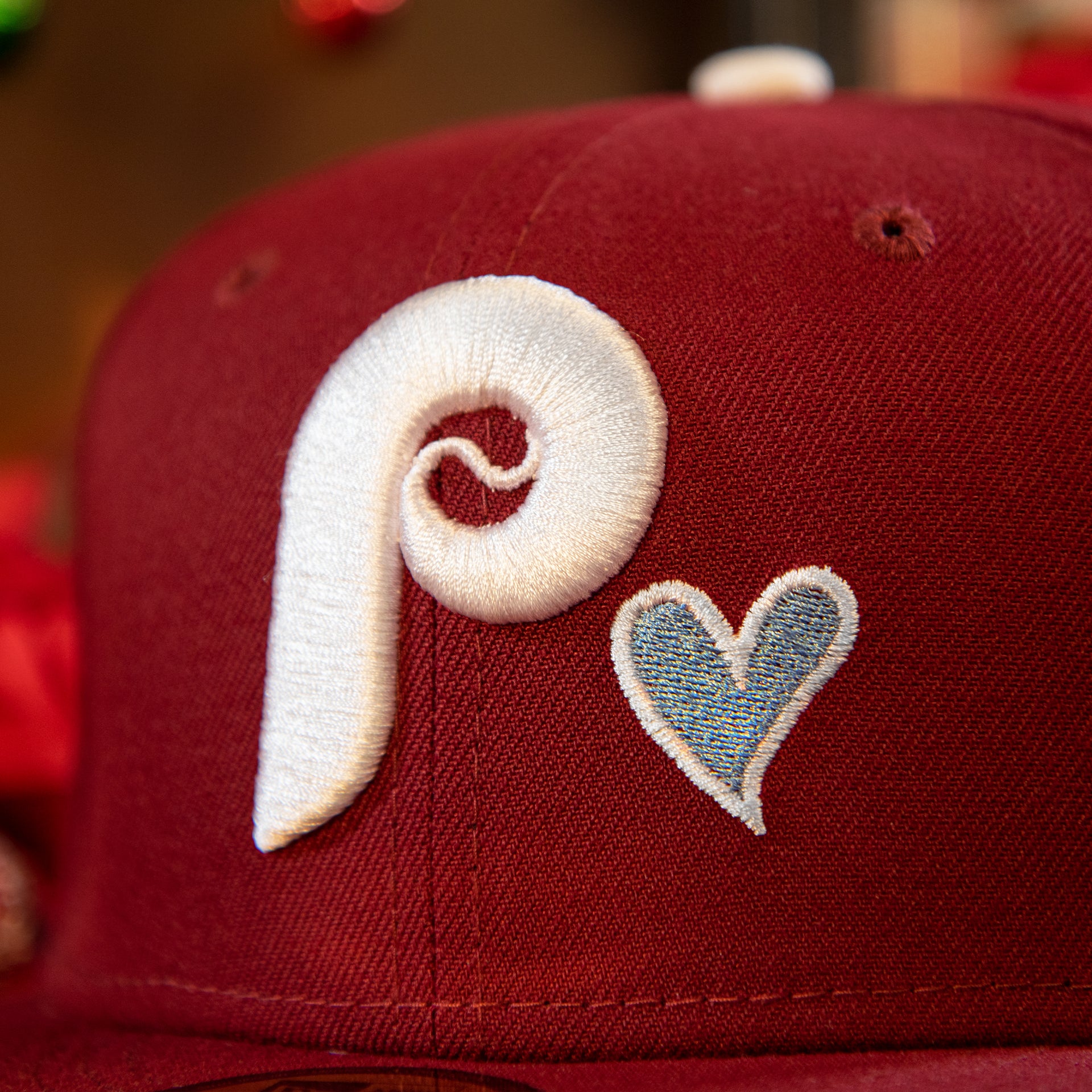Front: On the front side of this maroon patch fitted cap is the logo of the Phillies in white. Besides the Phillies logo, we can also see the patch of an icy blue heart on the front side of this Philadelphia Phillies 59fifty fitted hat.