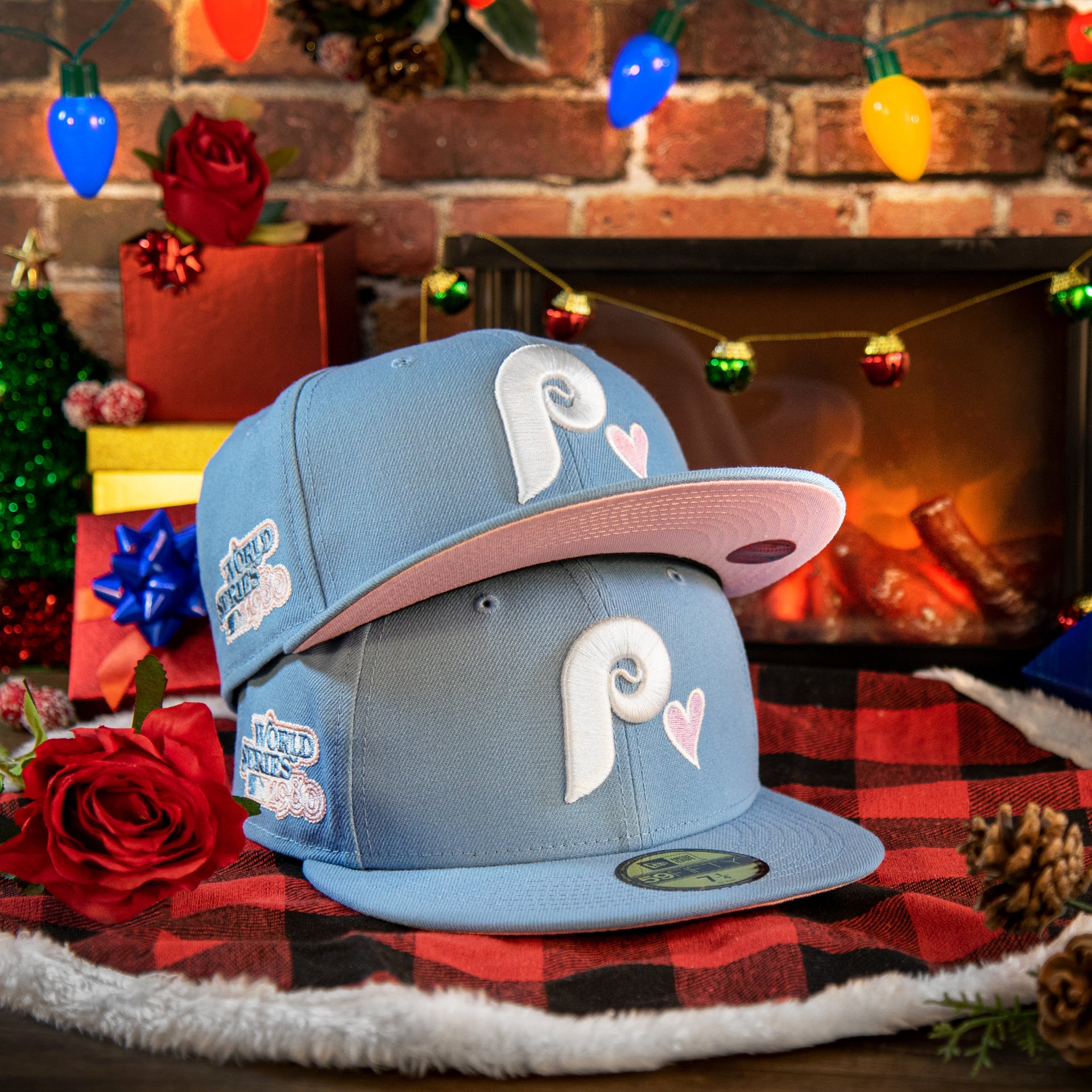 Philadelphia Phillies Heart Patch 1980 World Series Pink Bottom Brim Icy Blue Fitted Cap | Phillies Side Patch 59Fifty Fitted Cap
