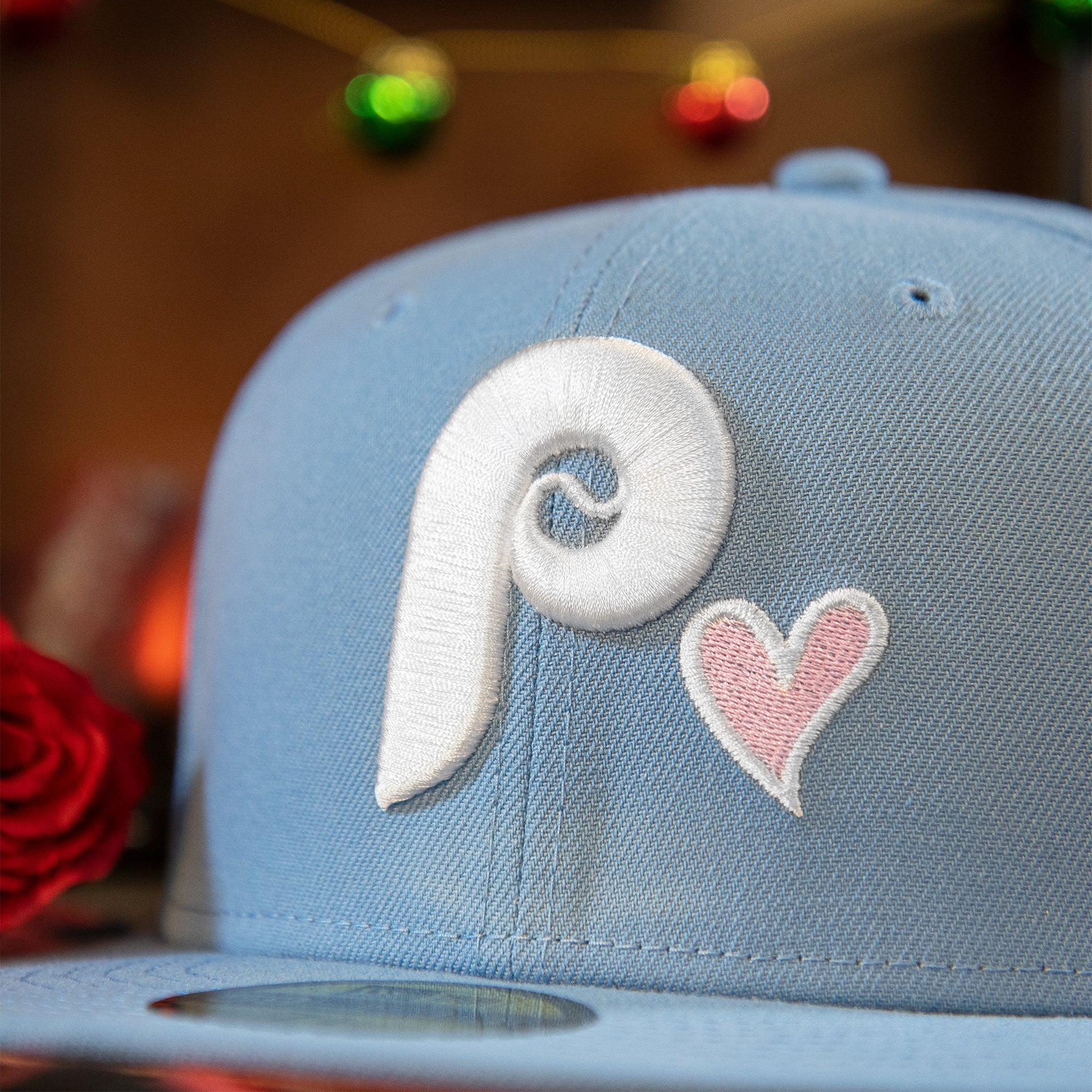 FRONT: The front of the Philadelphia Phillies 1980 World Series Pink Bottom Side Patch Icy Blue 59Fifty Fitted Cap | Valentine’s Day Pack features the Philadelphia Phillies logo embroidered in white alongside a heart logo embroidered in pink and white.