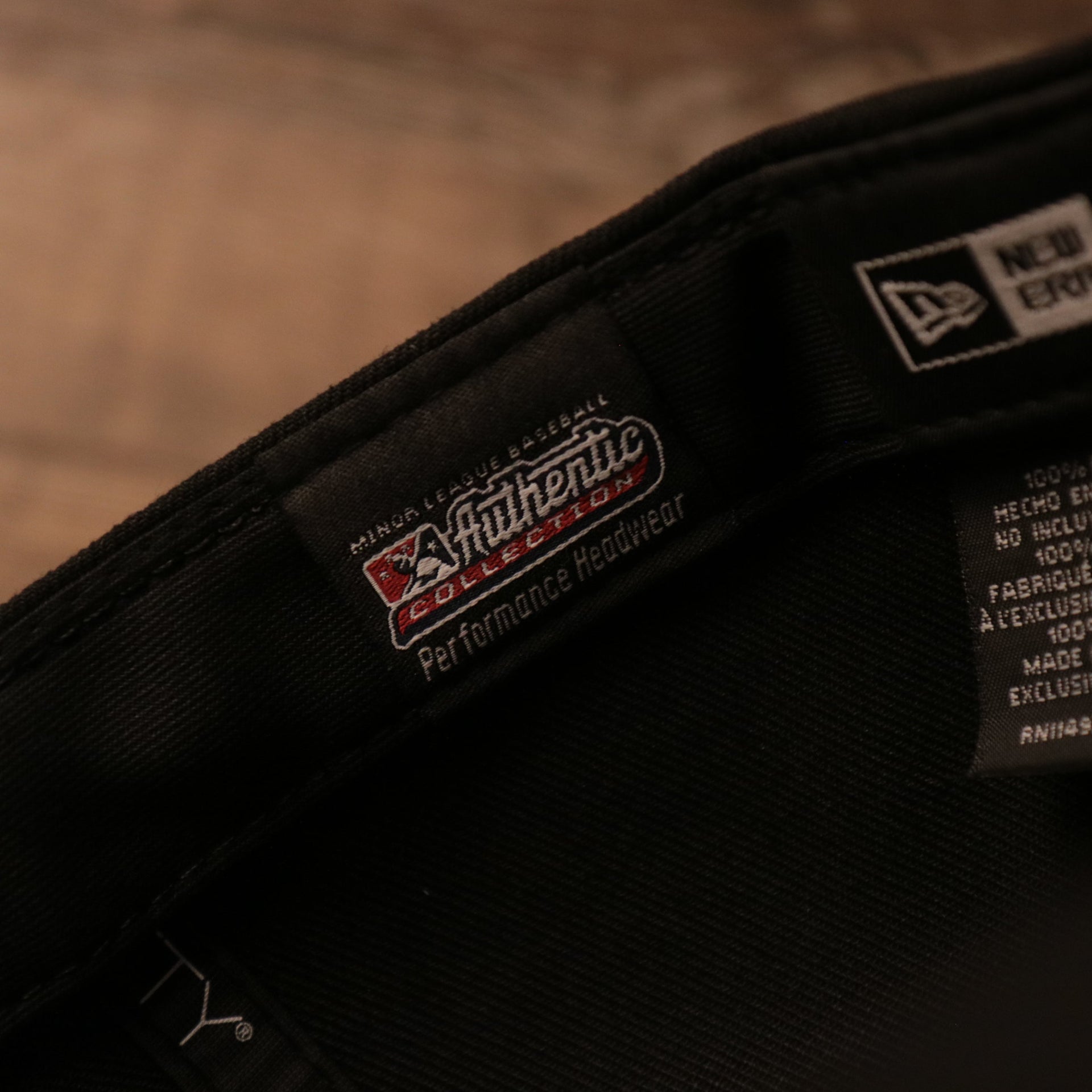 This black MiLB Copa hat is white on the front side, with the luchardores logo on the front which looks extremely cool. The rest of this luchador fitted cap is black with a red brim which adds to the cool look of this 59fifty fitted cap. On the wearer's left side of this MiLB Copa hat is the New Era logo, while on the back side is the MiLB logo.