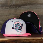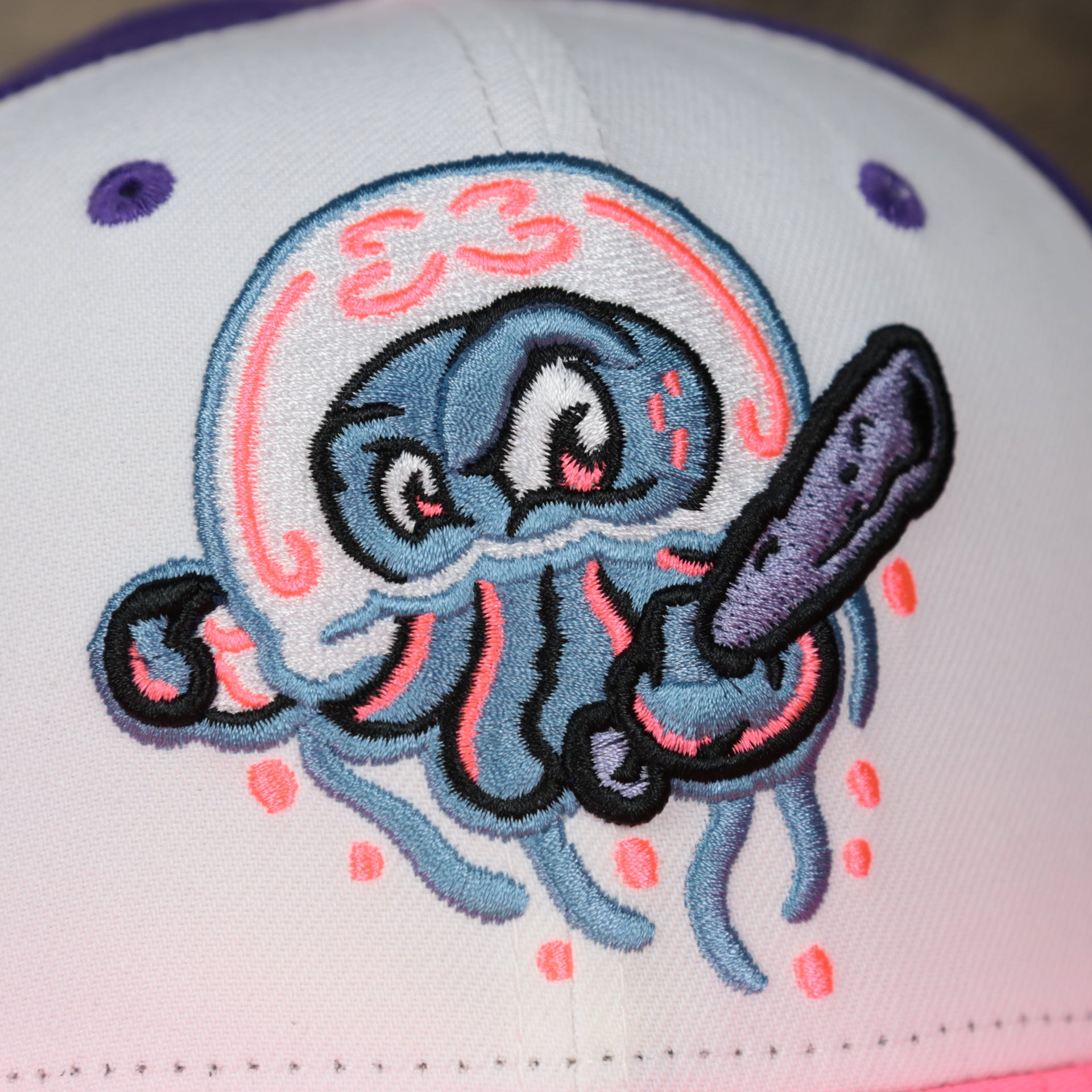 FRONT: Embroidered on the front of this Jersey Shore Blue Claws 2022 Medusas de Jersey Shore Copa de la Diversion On-Field Black Bottom 5950 Fitted Cap | Purple/White is the BlueClaws Copa Octopus logo that appears in 3D Blue, Black, and Pink.