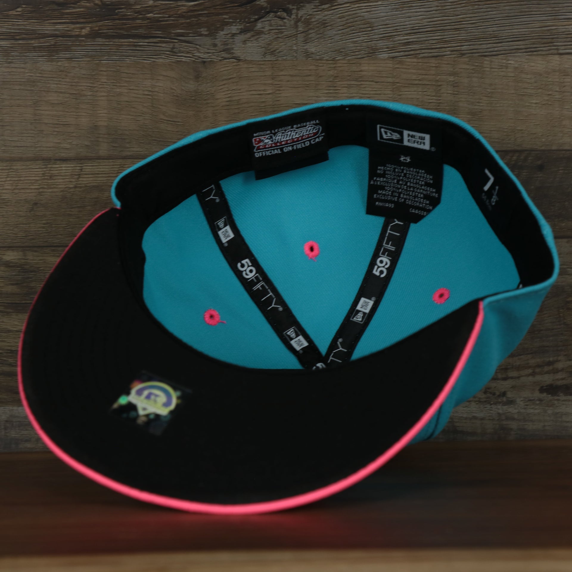 UNDER VISOR: As with all Black bottom fitted caps, this Lehigh Valley Iron Pigs 2022 Coquis de Lehigh Valley Copa de la Diversion On-Field Black Bottom 5950 Fitted Cap | Blue/Pink has a black under visor that perfectly ties into the Blue, Pink, and Navy colorway of the crown and brim. You can also find the classic black sweatband and taping on the inside of this Lehigh Fitted Cap.
