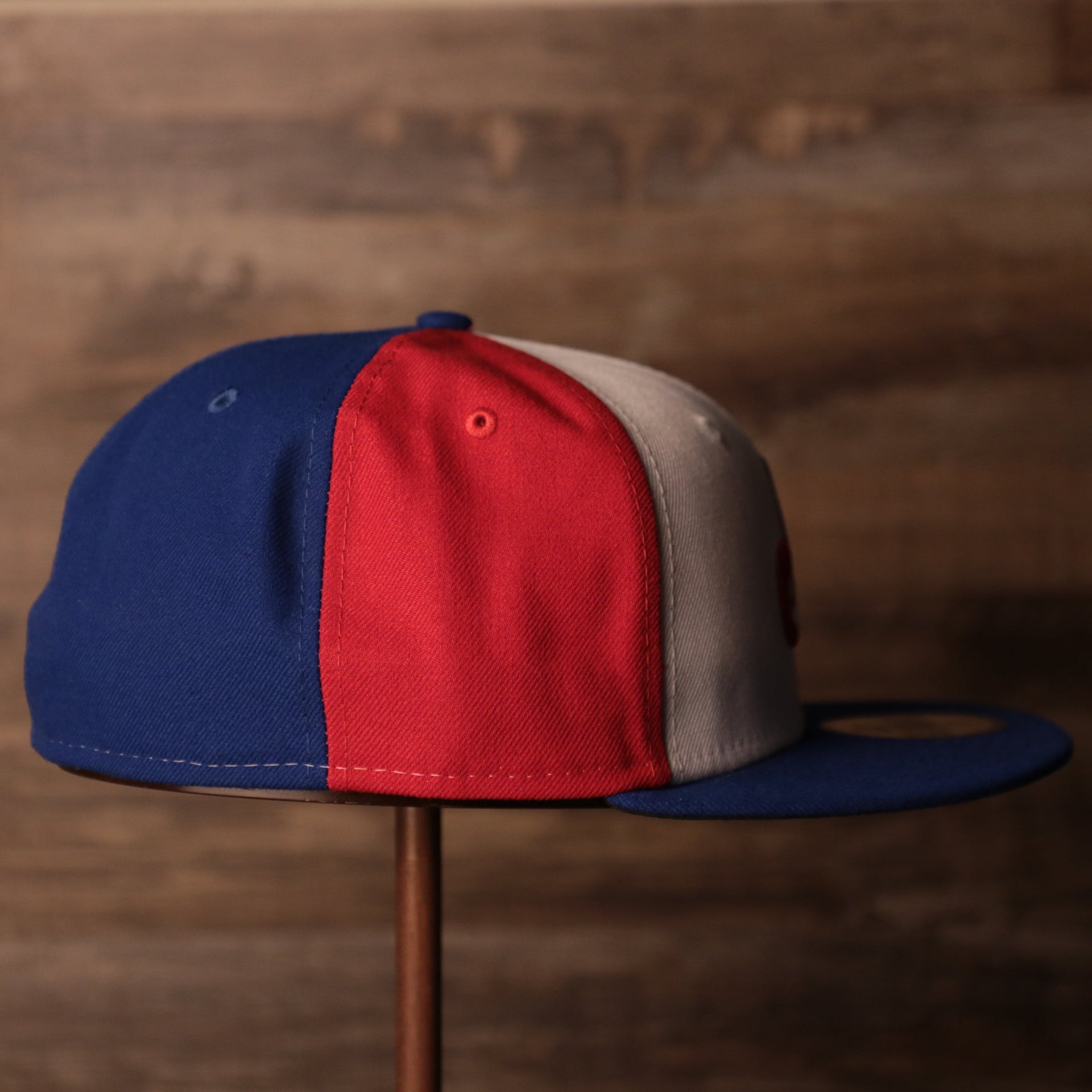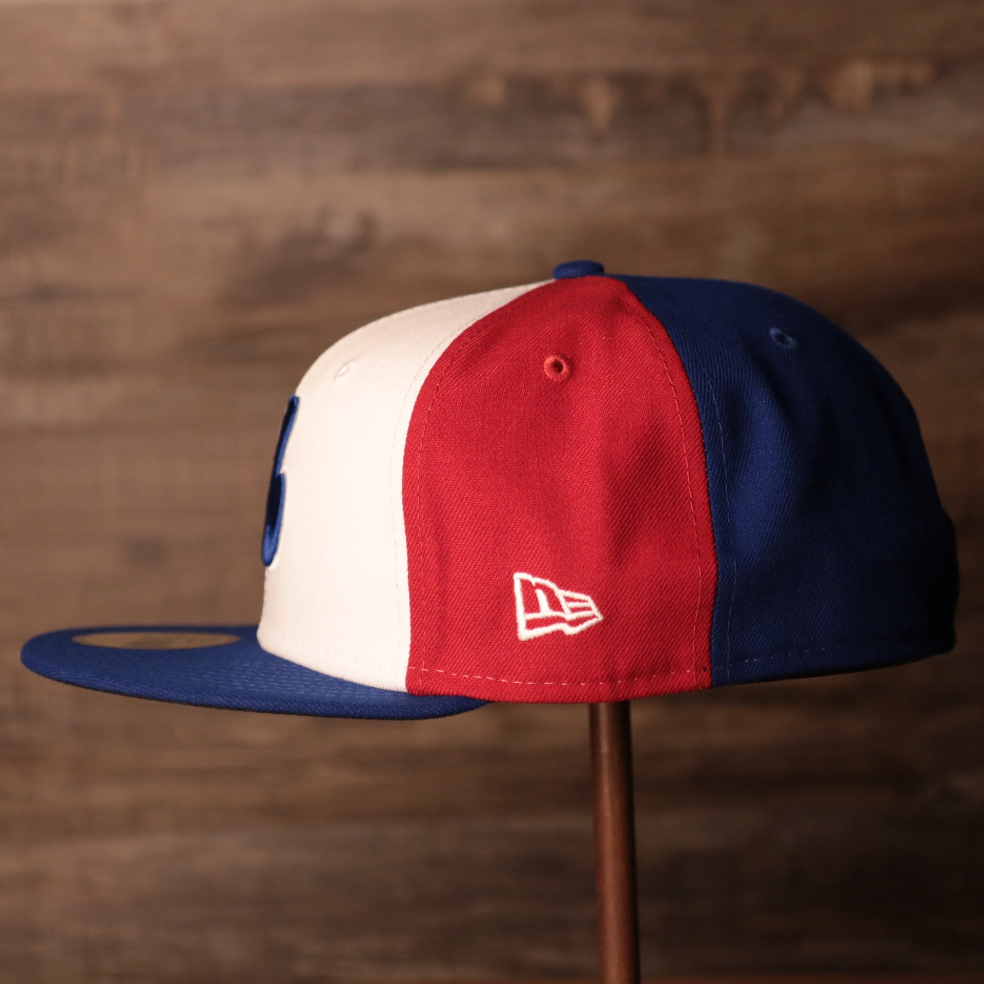 2) RIGHT SIDE: The right side of this cream 59fifty does not have any logo but because of its 1969 pinwheel design, but we can see all of the three colors on this Montreal Expos fitted hat.