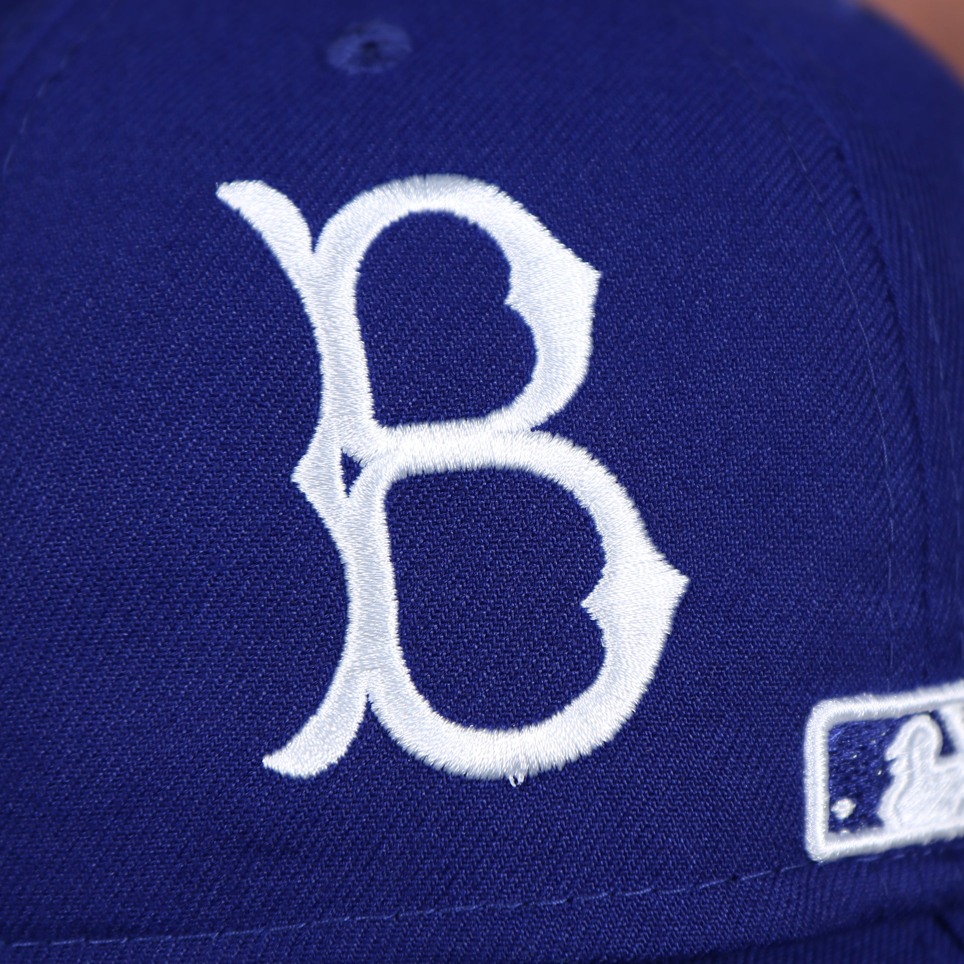 BACK: On the wearer's back left, the Los Angeles Dodgers "Patch Pride" All Over Gray Bottom Side Patch 59Fifty Fitted Cap the Brooklyn Dodgers logo is embroidered. The center back of the Los Angeles Dodgers "Patch Pride" All Over Gray Bottom Side Patch 59Fifty Fitted Cap, features the MLB Batterman logo embroidered. While, on the wearer's back right, of the Los Angeles Dodgers "Patch Pride" All Over Gray Bottom Side Patch 59Fifty Fitted Cap, the two-tone LA logo is embroidered.