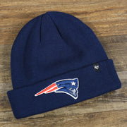 FRONT: The front of the Navy Blue New England Patriots Cuffed WInter Beanie features the New England Patriots Logo embroidered in the NFL Patriots Colorway.