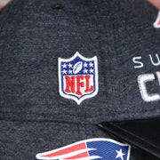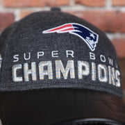 BACKSIDE: The backside of the New England Patriots Locker Room Super Bowl LI Championship Trophy 9Forty Dad Hat features a heather gray adjustable strap with the word Champions on them. Above that is the Super Bowl 51 Logo.