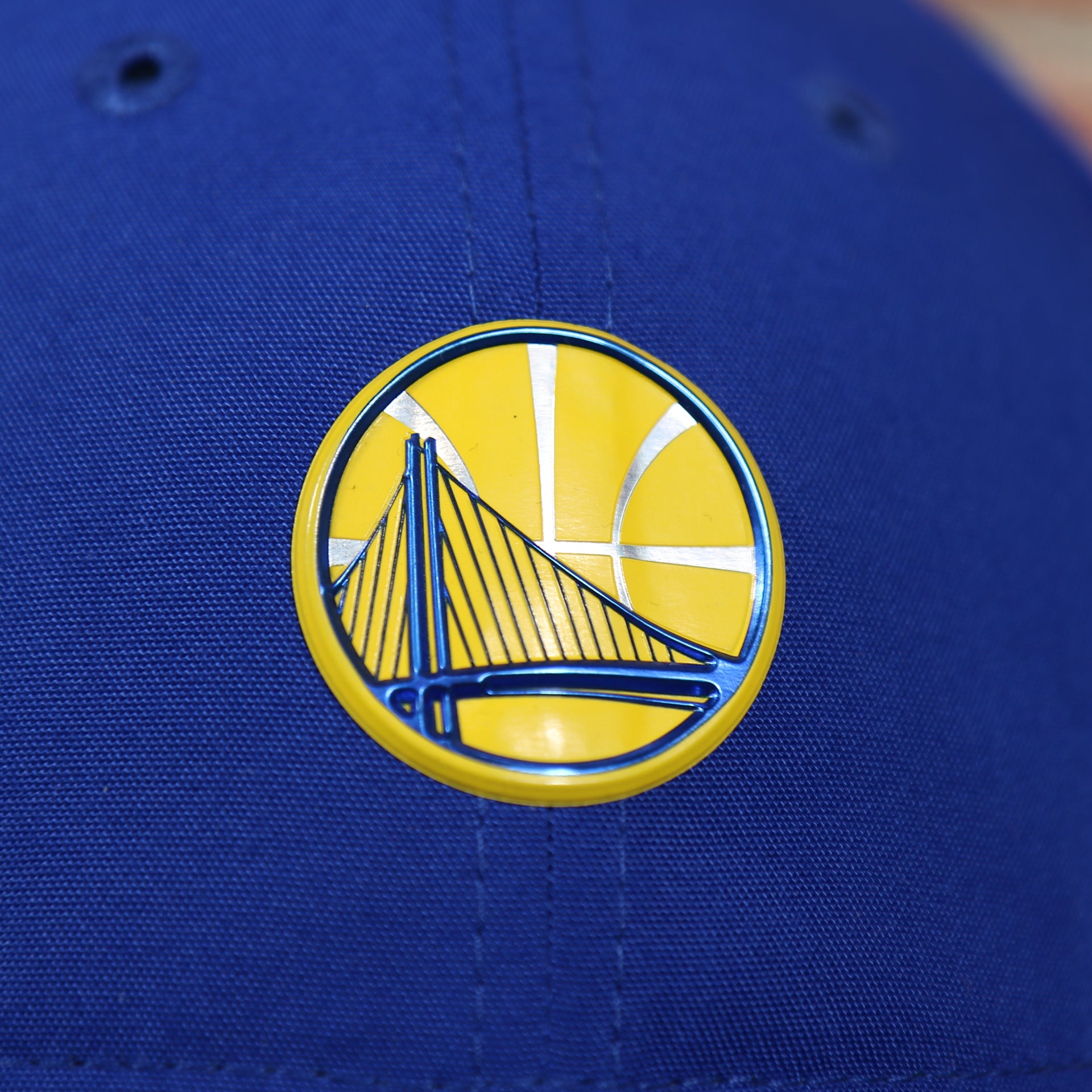 FRONT: The front of the Golden State Warriors blue on the court NBA draft dad hat is the Golden State Warriors logo applied in liquid metal in blue and yellow.