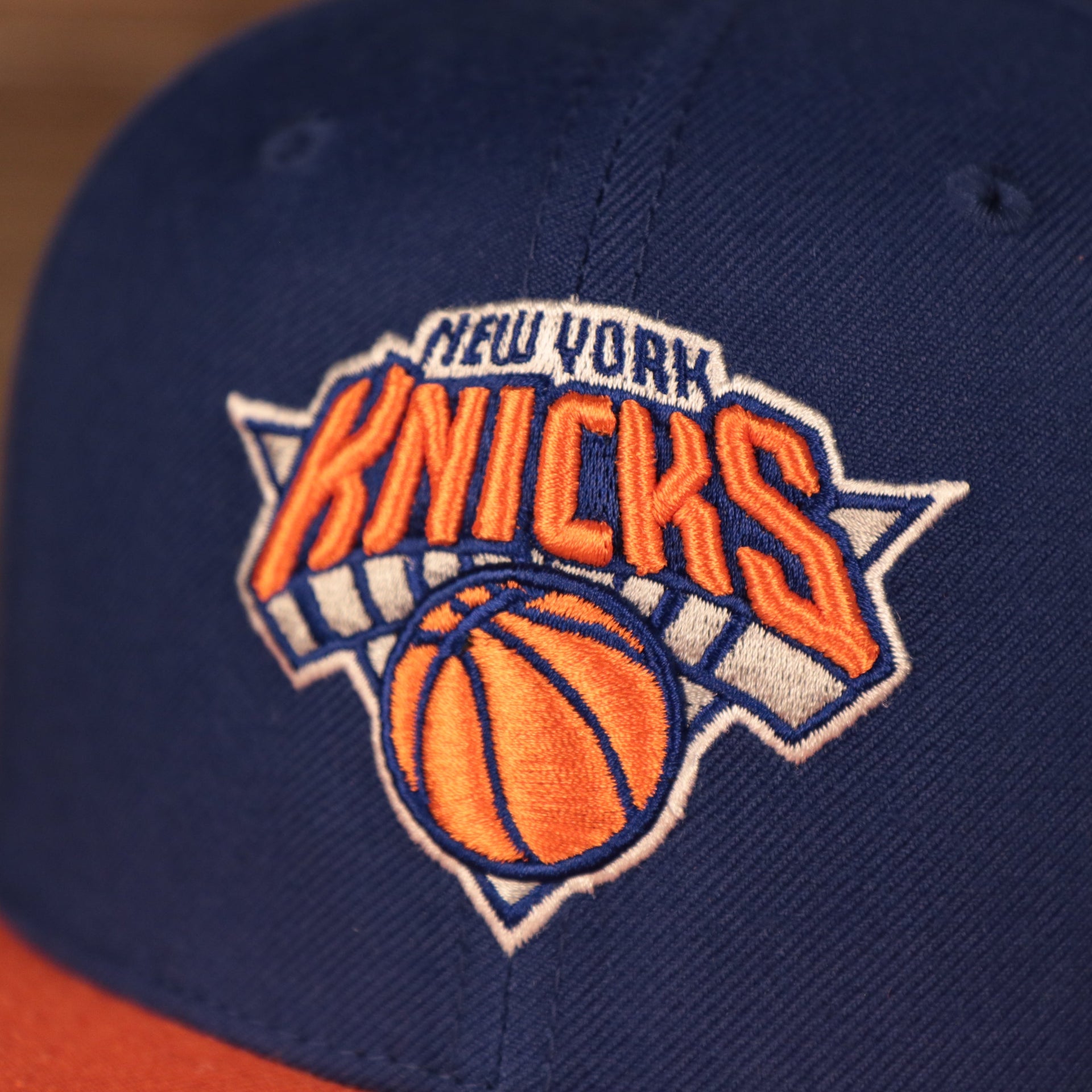 FRONT: Embroidered on the front of the New York Knicks Royal Blue and Orange Adjustable Grey Bottom Snapback Hat has the New York Knicks classic Knicks logo known by NBA fans around the world.