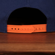 BACK: The back on this New York Snap Back is plain Blue, and an adjustable strap of the color Orange.