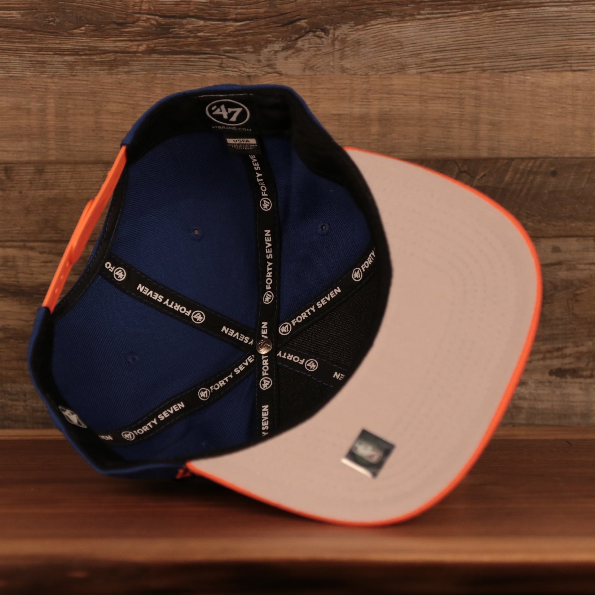 The current colorway of the New York Knicks never gets old. Something about the clean combination of the Royal Blue with the orange, the combo goes together perfectly. This New York Knicks Royal Blue and Orange Adjustable Grey Bottom Snapback Hat, as always in these collaborative endeavors, we design an exclusive gear for your wearing pleasure and the clothing experts over at 47 Brand manufacture it. This Knicks hat is one that if you are a die hard New York fan you need to add to your collection of caps. This Knicks Royal Blue and Orange Snapback Cap features timeless features, and they include: