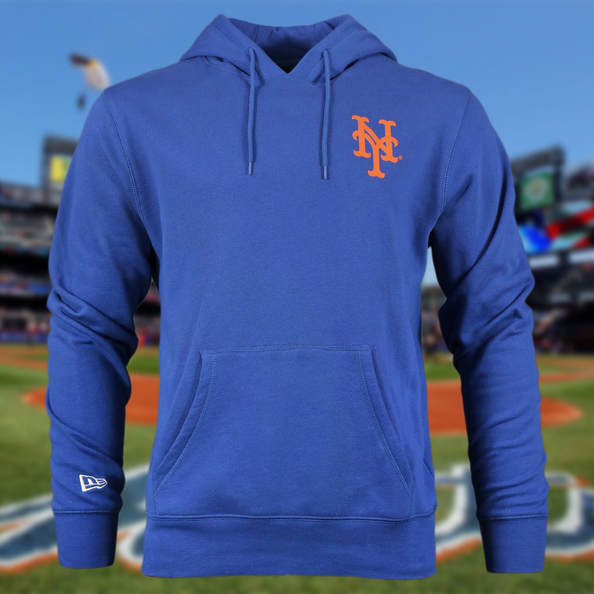 FRONT: On the front of the New York Mets "City Cluster" 59Fifty Fitted Matching Royal Pullover Hoodie is a screen printed New York Mets logo on the wearer's left chest.
