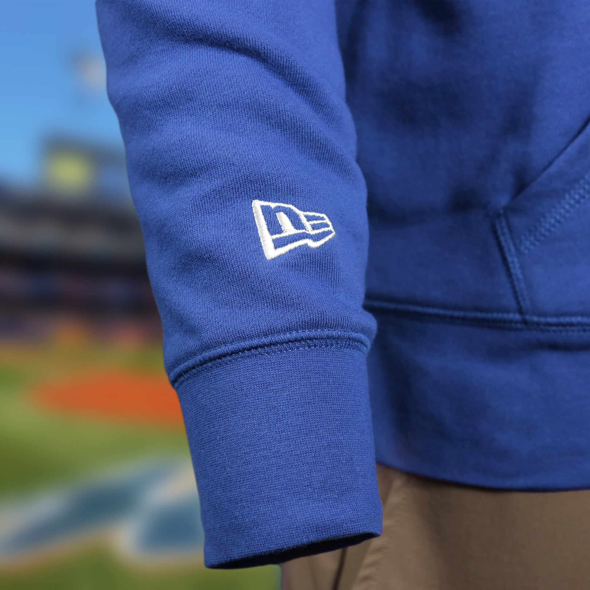 WEARER'S LEFT SLEEVE: On the wearer's left sleeve of the New York Mets "City Cluster" 59Fifty Fitted Matching Royal Pullover Hoodie, the New Era logo is embroidered in white.