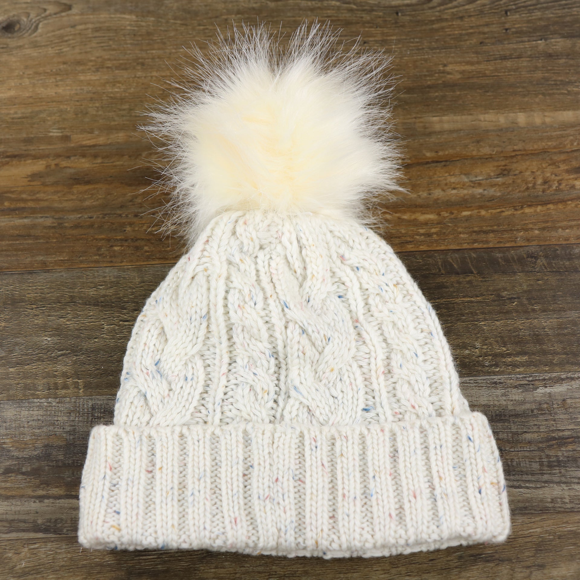 POM POM: The Women’s Winter Knit Confetti Print NFL Eagles Logo Pom Pom Beanie features a Cream Pom Pom.