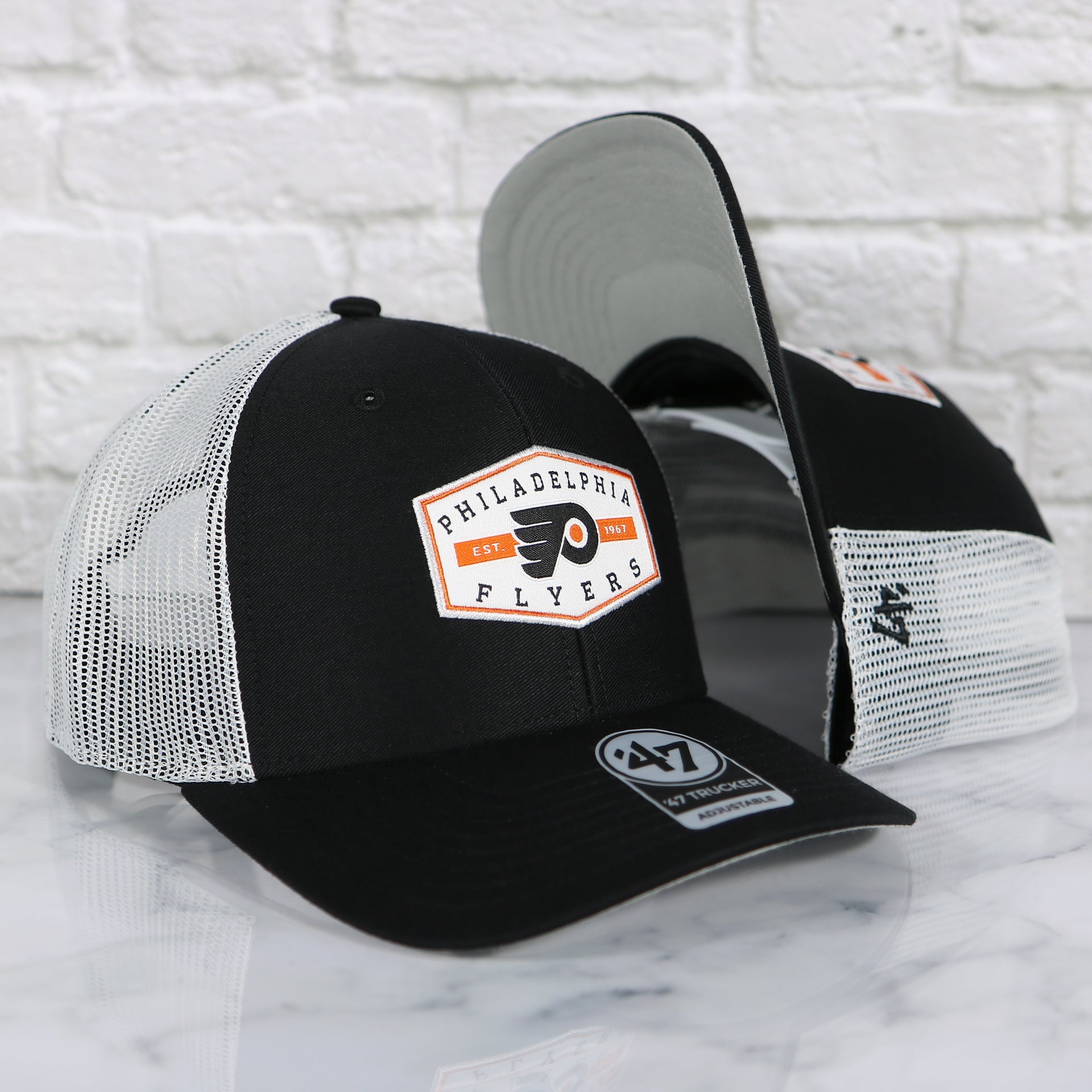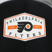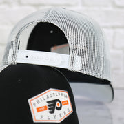 WEARER'S RIGHT: The wearer's right of this Philadelphia Flyers Est 1967 Patch Black/White Trucker Snapback Hat is plain White Trucker