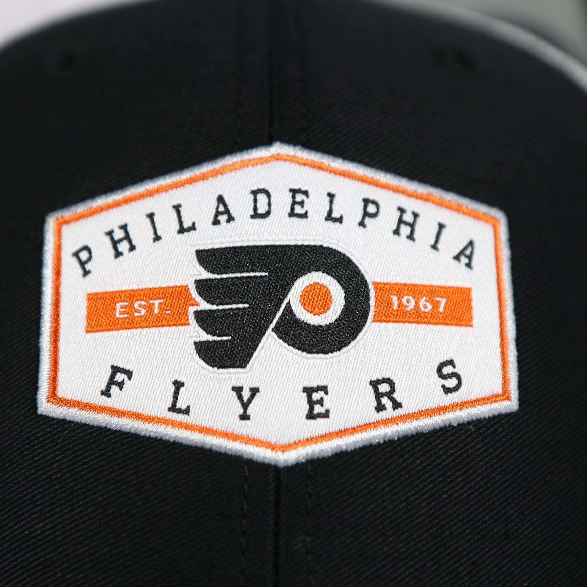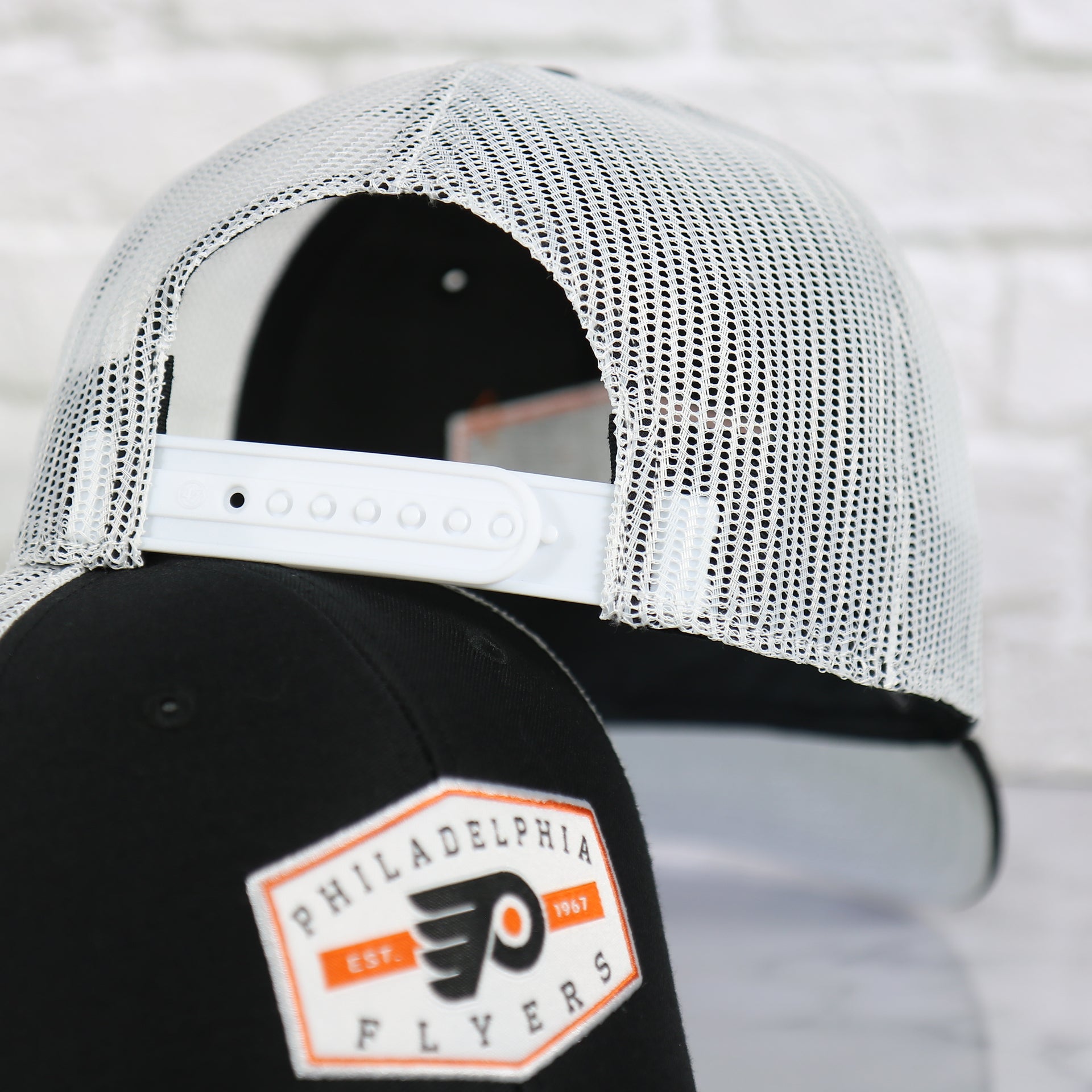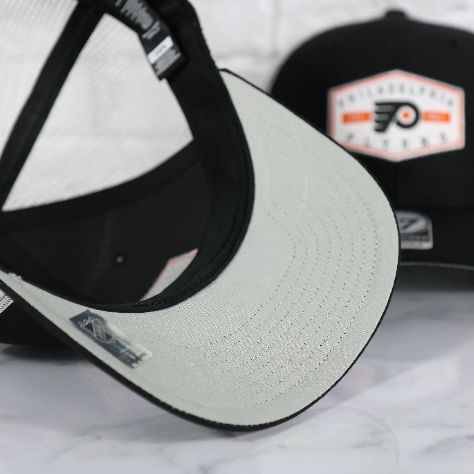 UNDER VISOR: As with all grey bottom Trucker Snap backs, this Philadelphia Flyers Est 1967 Patch Black/White Trucker Snapback Hat has a grey under visor that perfectly ties into the Black colorway of the crown and Black brim. You can also find the classic black sweatband and taping on the inside of this Black Flyers Trucker Snapback Cap.