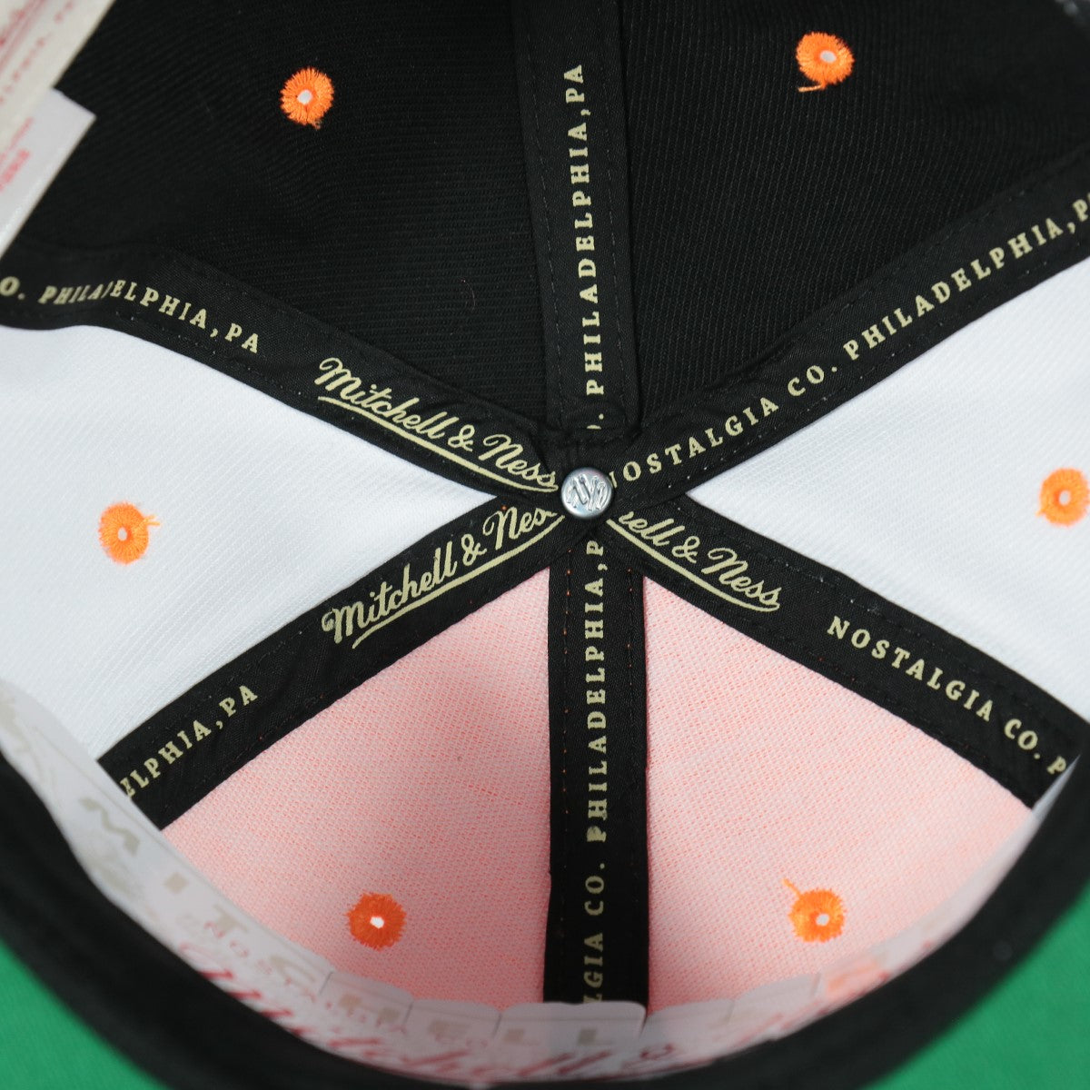 BACK: The back of the Philadelphia Flyers NHL Billboard 2 Green bottom Tri-Tone | Orange/White/Black Snapback Hat has the mitchell and ness logo in orange.