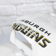 SWEATBAND: The sweatband of the Pittsburgh Penguins NHL In Your Face Deadstock Yellow bottom | White Snapback Hat is white.