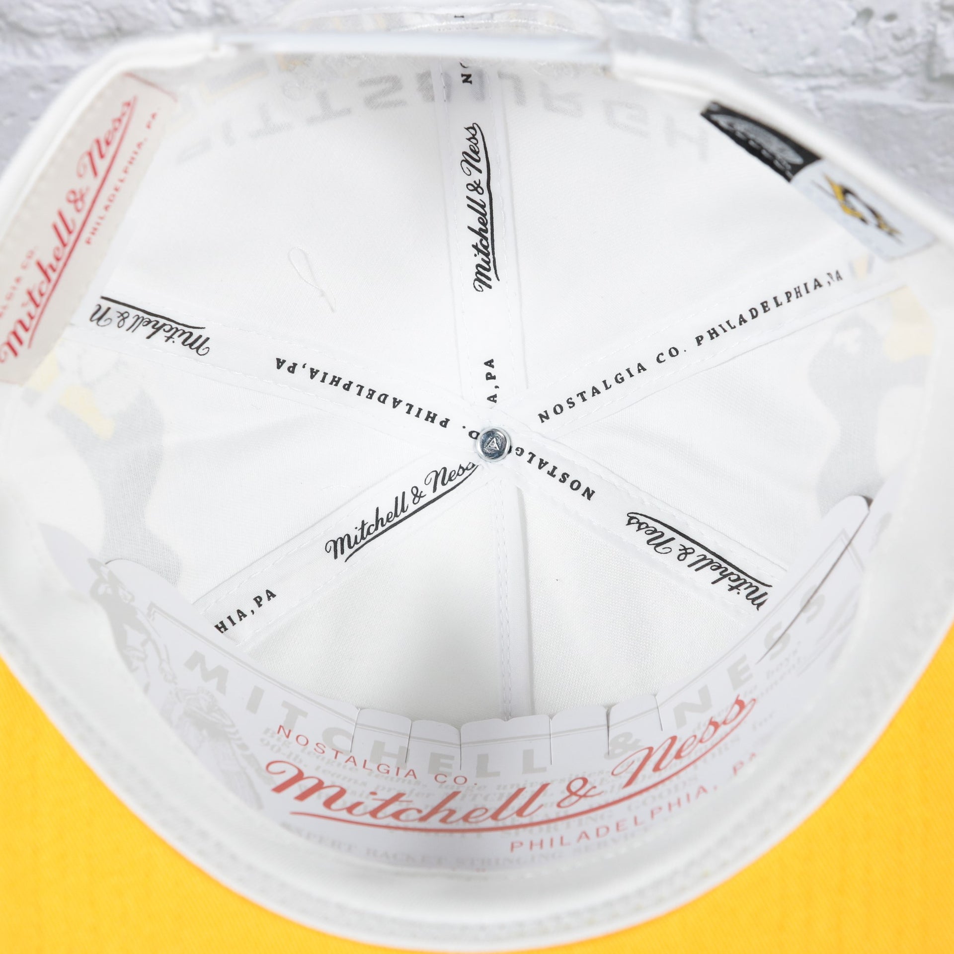 BACK: The back of the Pittsburgh Penguins NHL In Your Face Deadstock Yellow bottom | White Snapback Hat has the mitchell and ness logo in white.