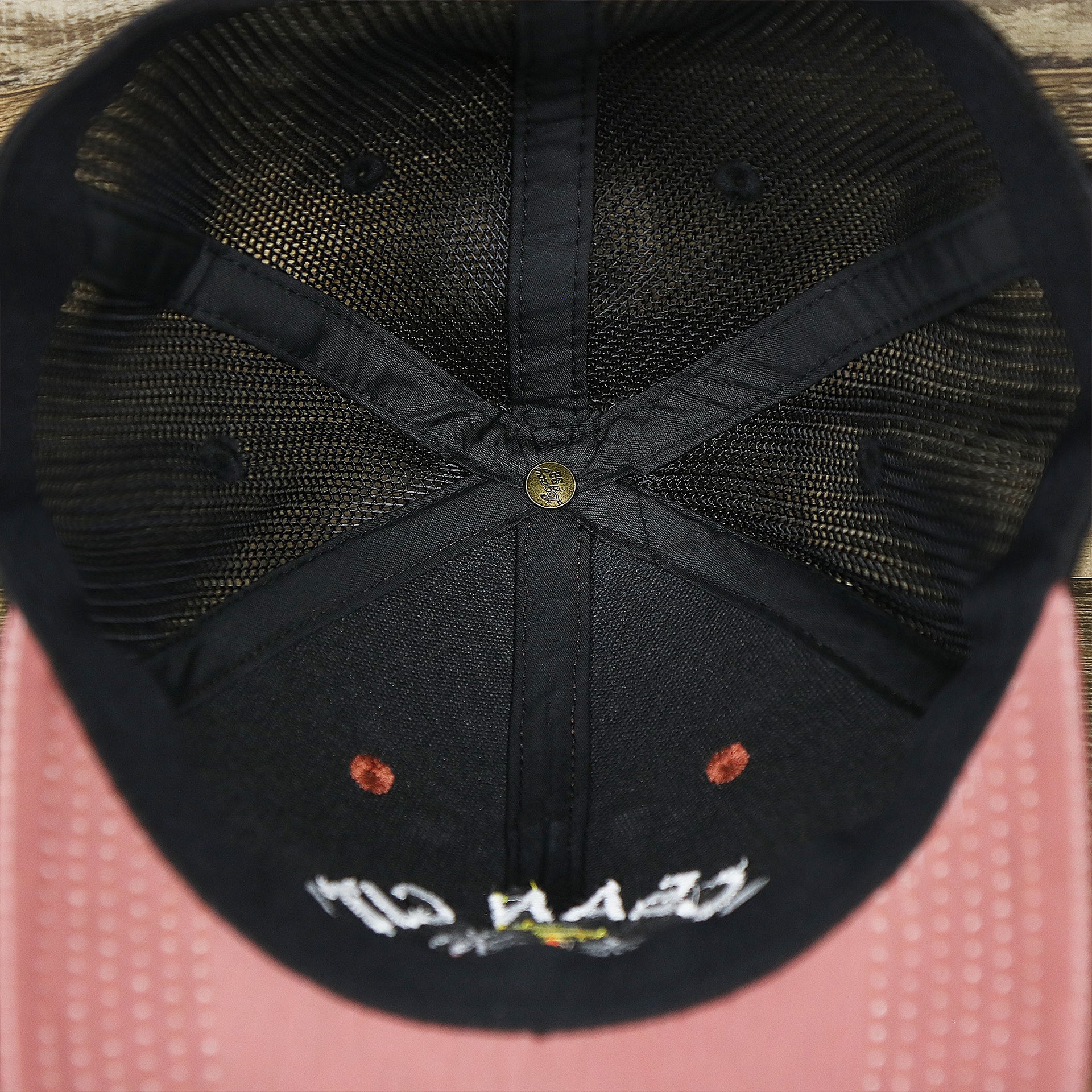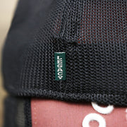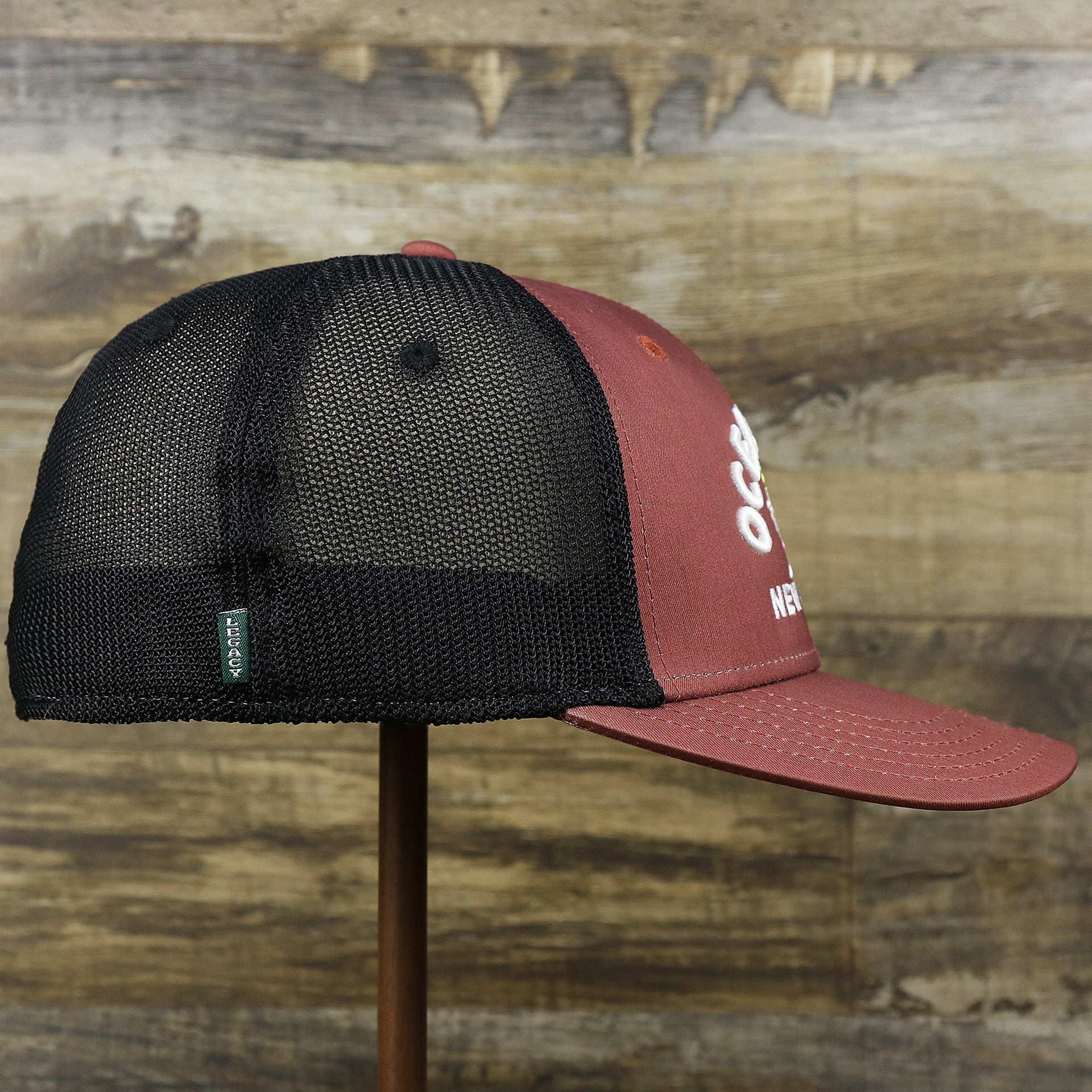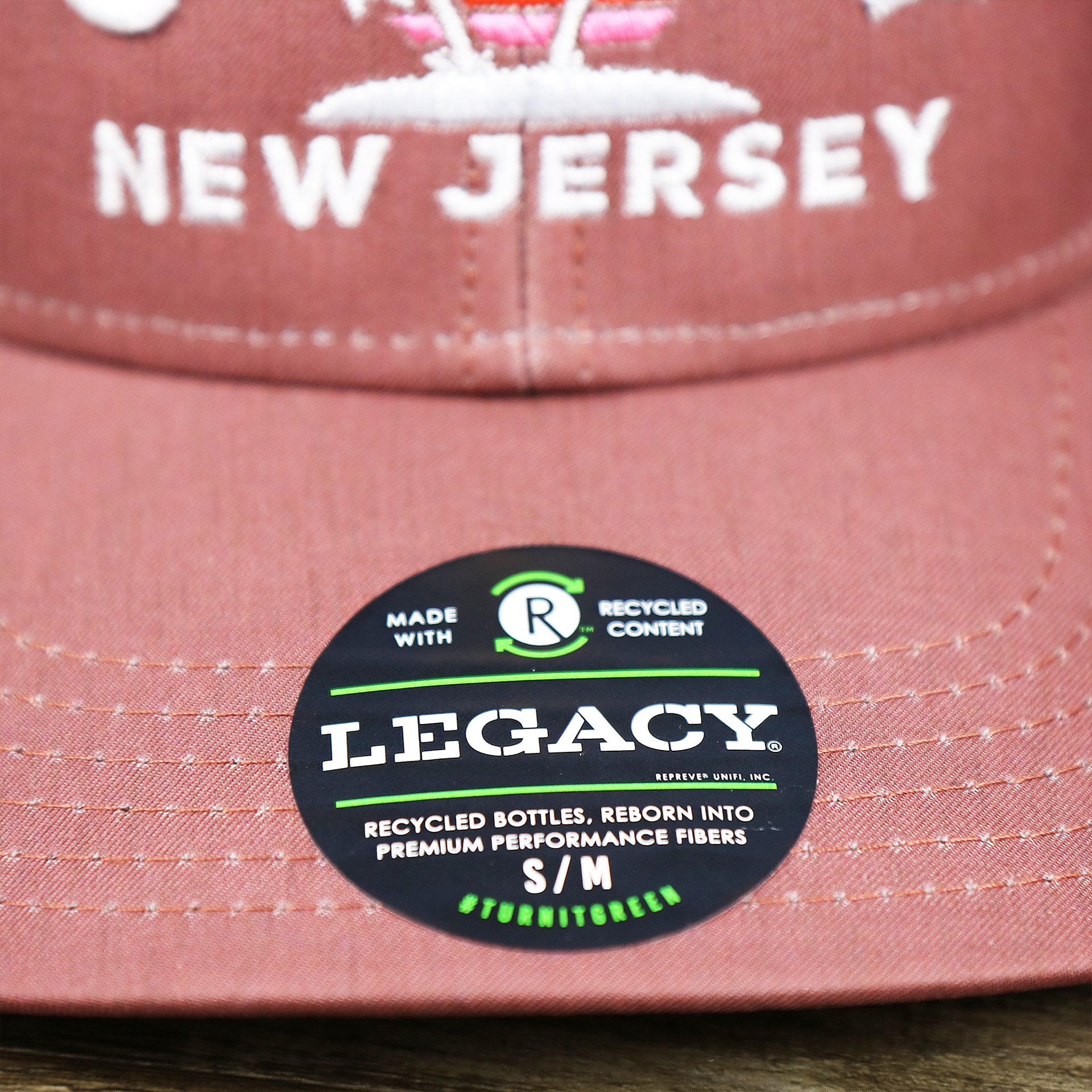 WEARER’S RIGHT: The wearer’s right of the Mesh Back OCNJ Palm Tree Sunset New Jersey Stretch Fit Hat features the Green Legacy Tag