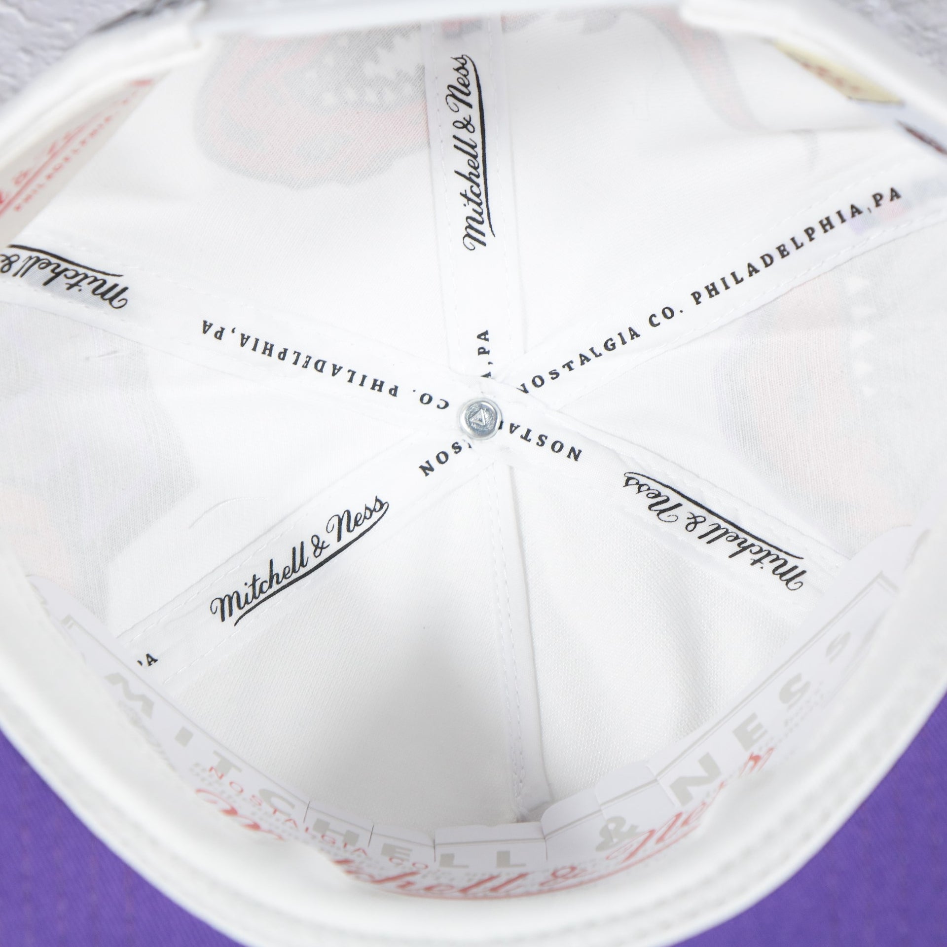 BACK: The back of the Toronto Raptors Hardwood Classics In Your Face Deadstock Purple bottom | White Snapback Hat has the mitchell and ness logo in white.