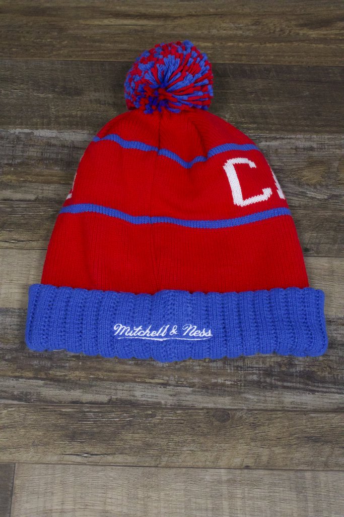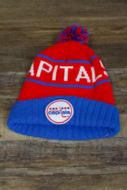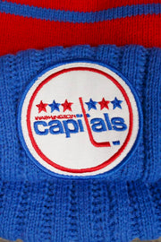 Stay warm while cheering on the Washington Capitals from rink-side this NHL season. The Washington Capitals winter knit hat features a red crown, a blue raised cuff along and a multicolored pom pom. This Washington Capitals beanie will be sure to elevate your Washington Capitals outfit thanks to the Washington Capitals patch stitched on the front of the raised cuff. On the back is the classic Mitchell and Ness script logo embroidered in white. Across the red crown of the Capitals winter knit hat is the CAPITALS wordmark in white lettering.