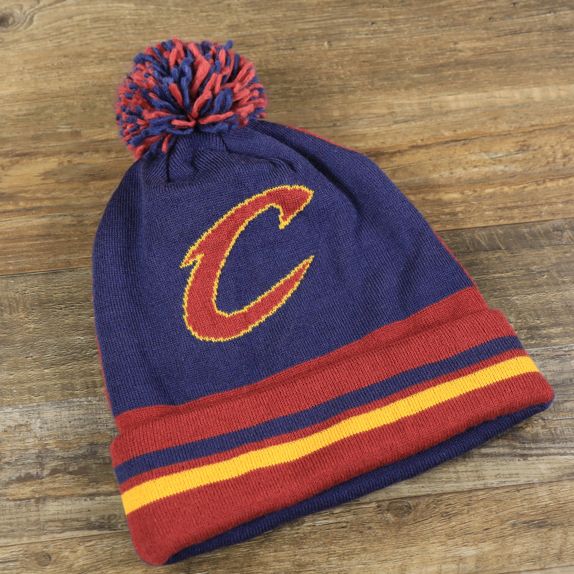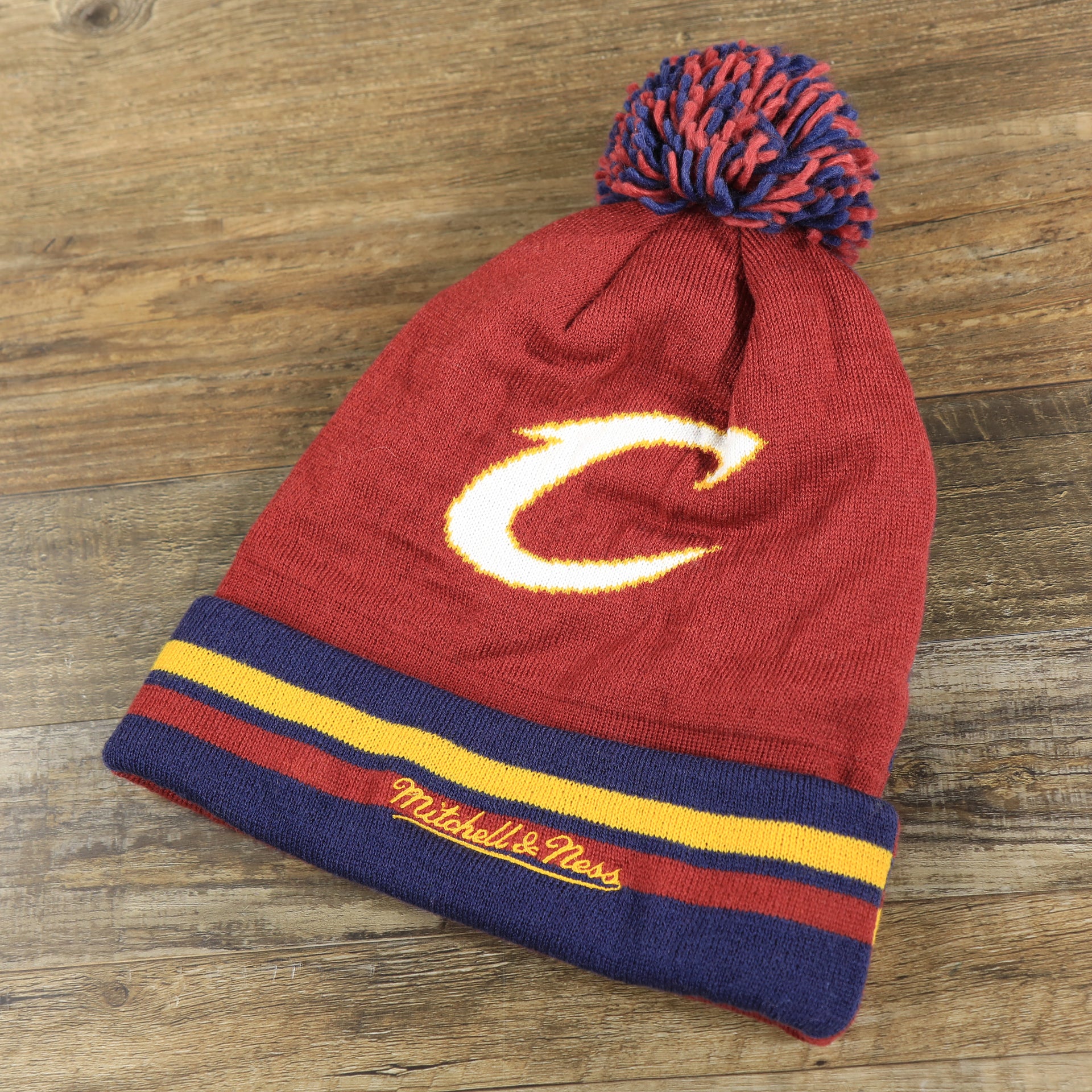 Shop the Cleveland Cavaliers Two Sided Double Design Retro Logo Winter Beanie to rock a unique Cleveland Cavaliers Winter Beanie to help you show love for the Cavaliers as they compete all basketball season long. The Cleveland Cavaliers Vintage Two Sided Double Design Winter Beanie features two separate designs on the alternate sides of the knit cuff winter pom beanie. Get two beanies in one, with the Cleveland Cavaliers Two Sided Double Design Throwback Winter Beanie! On the front of the double design Cleveland Cavaliers Two Sided Winter Beanie, the crown is navy blue, the raised cuff is maroon with navy blue and yellow horizontal stripes. and the retro Cleveland Cavaliers logo is on the front of the crown. On the back of the double design Cleveland Cavaliers Two Sided Winter Beanie, the crown is maroon, the raised cuff is navy blue with yellow and maroon horizontal lines and the Mitchell and Ness logo embroidered in yellow. On the back of the crown the vintage Cleveland Cavaliers logo appears.