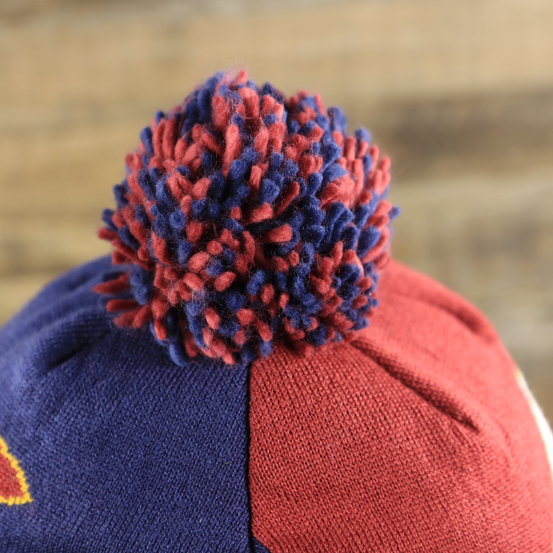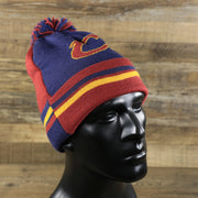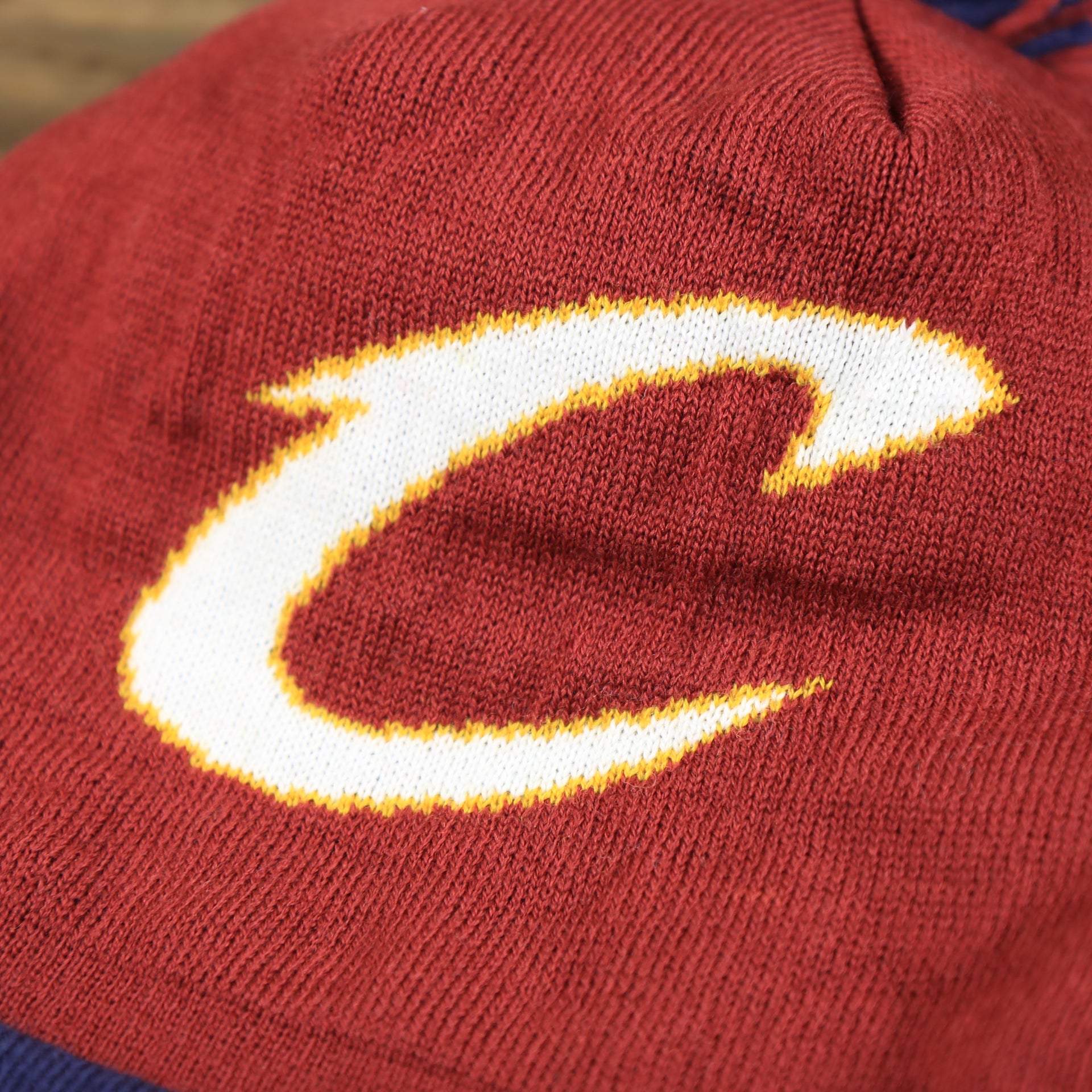 FRONT: The front of the Double Sided Cleveland Cavaliers Retro Logo Pom Pom Winter Beanie features the Retro Cavaliers Logo Embroidered in Maroon and Yellow.