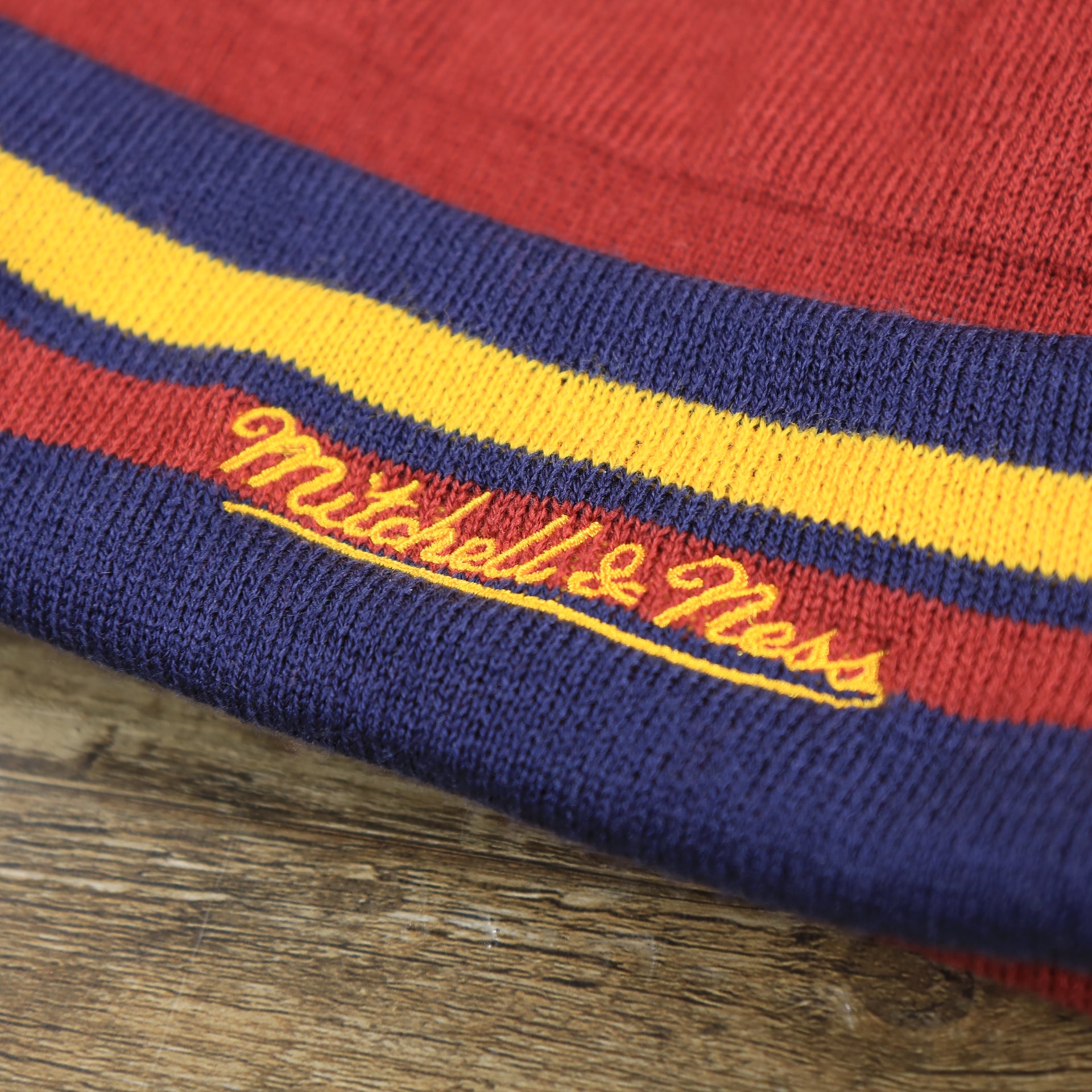 BACKSIDE: The backside of the Winter Cavaliers Two Sided Striped Knit Beanie features the Vintage Cavaliers Logo embroidered in White And Yellow and the Mitchell And Ness Script Logo Embroidered in Yellow.