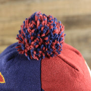 POM POM: The Striped Cuff Double Sided Retro Logo Winter Beanie features a Maroon And Navy Blue Pom Pom.